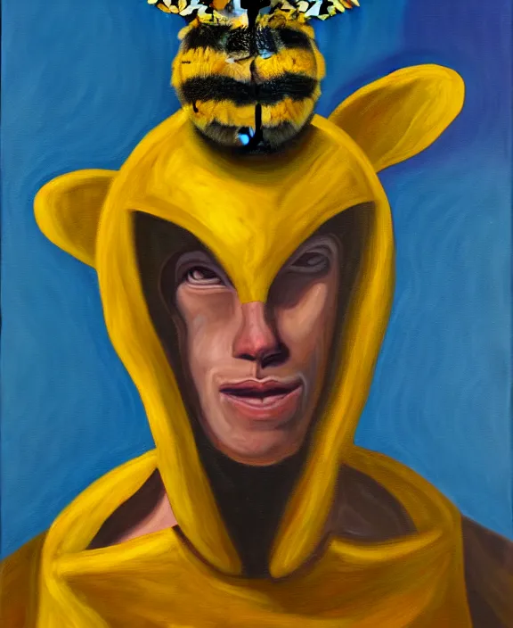 Prompt: A handsome man with a pair of pants around his head, oil on canvas