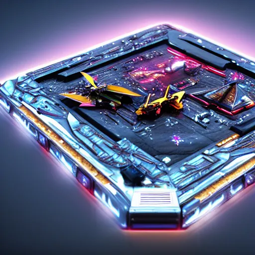 Prompt: product photography framing. digital paint krita render of a small square fantasy vacuum - tube motherboard made and powered by crystalline circuitry. trending on artstation. premium print by angus mckie