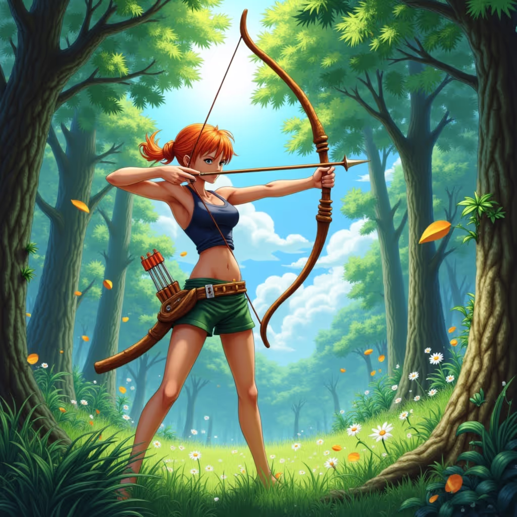 Nami in a Jungle: Picture Nami exploring a dense jungle, using her navigation skills to uncover hidden treasures and ancient ruins.