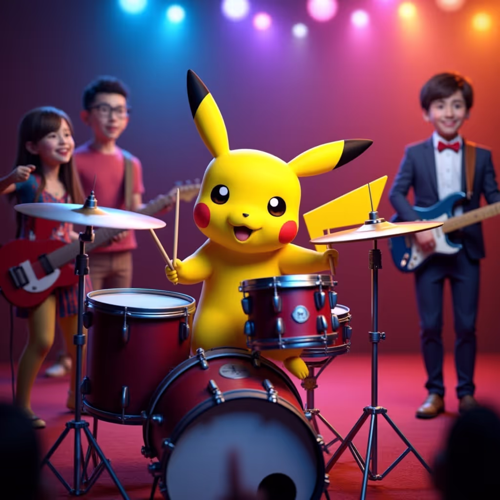 Pikachu at Concert: Visualize Pikachu on stage at a rock concert, holding a guitar and performing in front of an excited crowd.