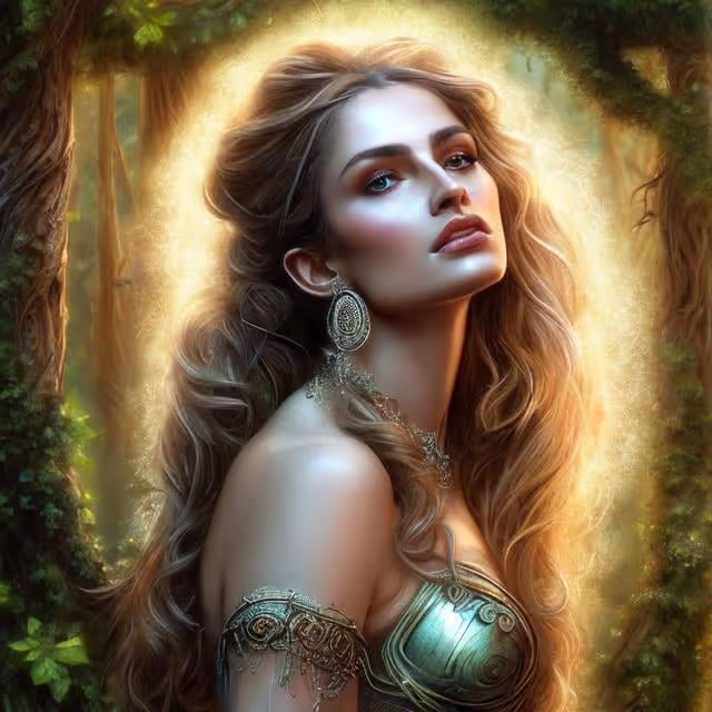 - एल्वेन प्रिंसेस: एक एल्वेन प्रिंसेस का पोर्ट्रेट, जो एक चमकदार, पत्तों के पैटर्न वाली गाउन में, एक धूप से भरे जंगल के साफ़ हिस्से में खड़ी है, उसके बालों में चांदी के पत्ते और तारों की रोशनी बुनी हुई है।
