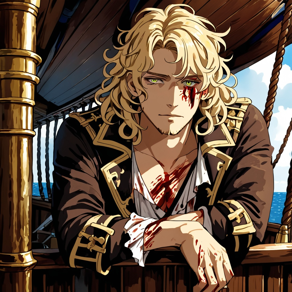 A handsome blond man with wavy hair, leaning on the railing in a pirateship. He is bloody and wounded. His eyecolor are gold