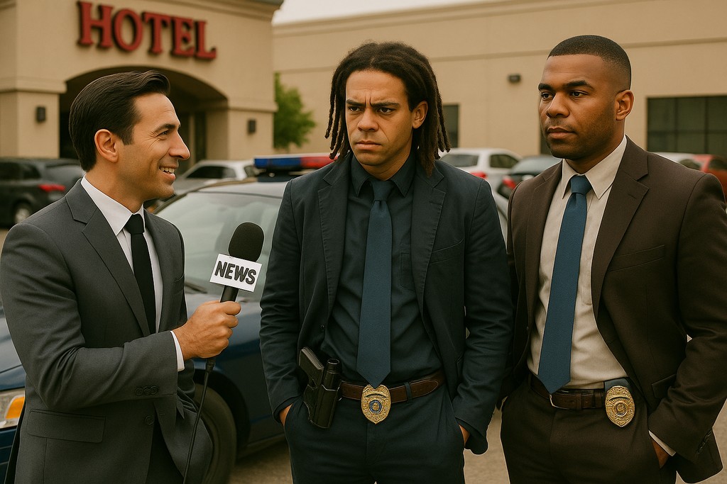The reporter tries to get a statement from the two detectives as they walk past the reporter to the hotel entrance as