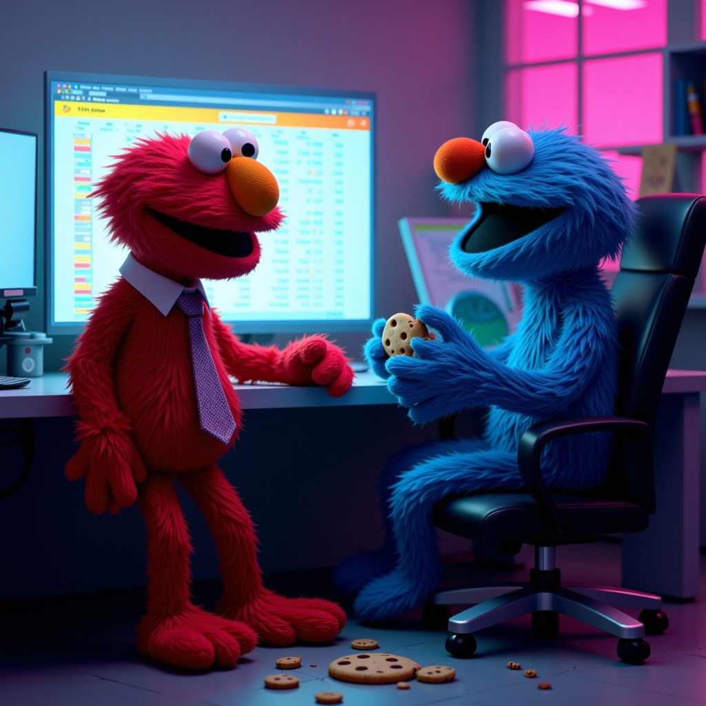 A **flat vector illustration**, **stylized ZBrush CG Render** of young Elmo...Show more
