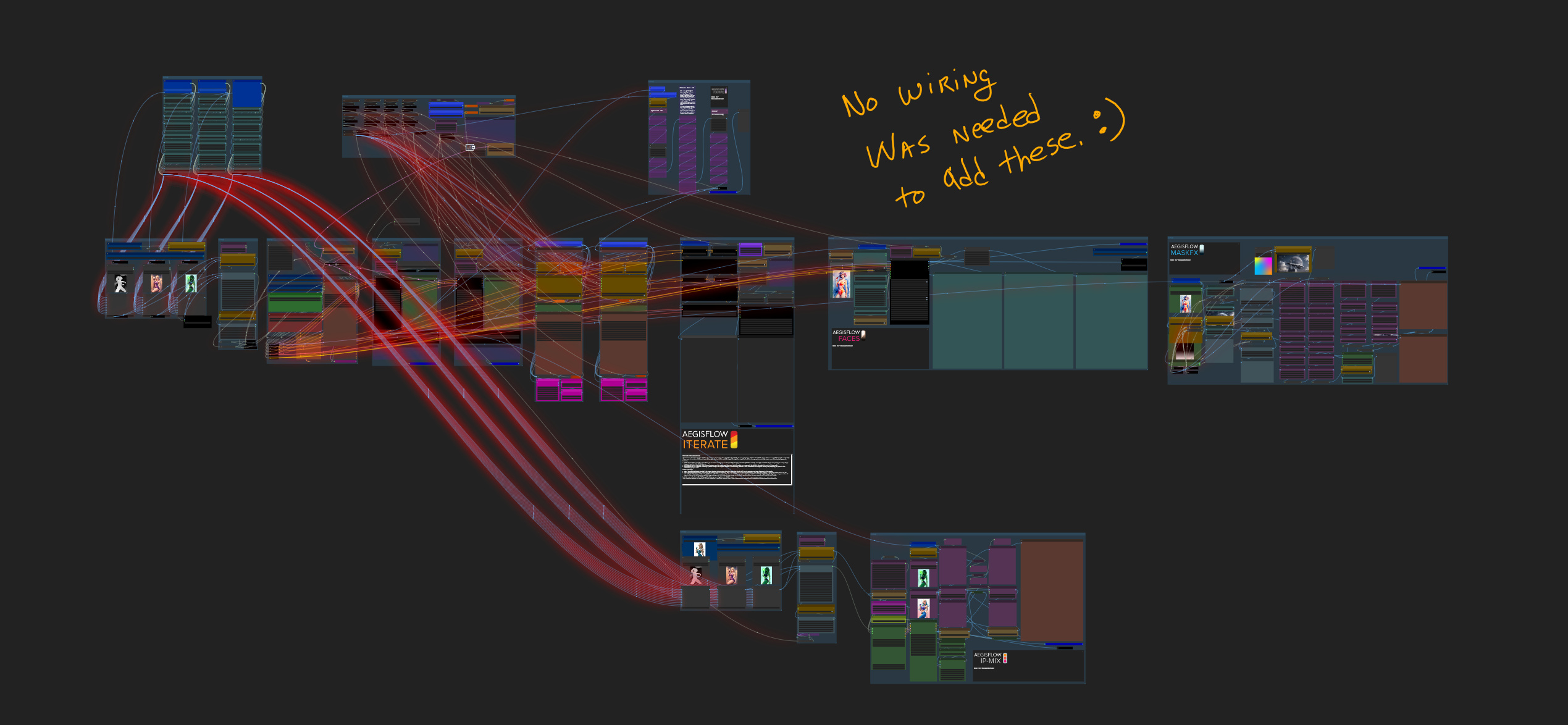 AegisFlow uses virtualized wiring that creates one-to-many links between nodegroup "islands," allowiing a fully modular construction and a new way to build workflows from reusable components. You right click and add modules (node templates) that are a growing collection of task-oriented separate workflows that can be combined in as many ways as you want and integrated with modules that users can make themselves, either with virtual or wired connections. wiring between modules is automatic!