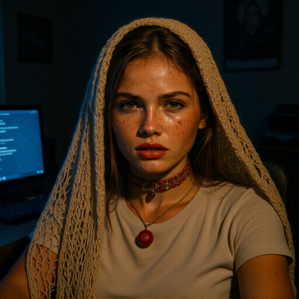 2-An Ultra realistic, medium shot presented as a grainy, pixelated screenshot of a late-night video call. The stunningly beautiful woman with captivating hazel-green eyes and a constellation of natural freckles is sitting at her desk in a dimly lit room. She is looking directly into her webcam, and therefore at the viewer, with a tired but focused and engaged expression. The only illumination comes from the cool, blue-white light of her computer monitor, which casts a stark, digital glow on her face and creates deep shadows. She wears a comfortable, loose-fitting t-shirt, and her delicate, beige crocheted net shawl is draped over the back of her chair, visible as a soft shape in the poorly lit background. The background is a blurry, authentic mess of her room: the corner of a bookshelf, a poster on the wall, and general clutter. The image quality is intentionally low, with visible compression artifacts and digital noise, perfectly capturing the "amateur" webcam aesthetic.