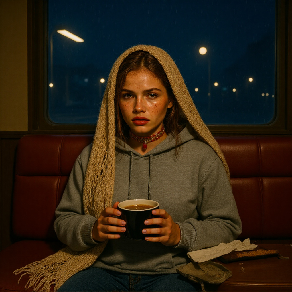 1- An Ultra realistic, full-body shot of the stunningly beautiful woman with captivating hazel-green eyes and a constellation of natural freckles, captured in the candid, lonely style of amateur photography. She is sitting alone in a worn-out, red vinyl booth in a dingy 24-hour diner at night. The camera is positioned across the table, slightly crooked, as if taken by a companion. She is dressed in a simple, oversized gray hoodie and comfortable jeans. Her delicate, beige crocheted net shawl is slung over the back of the booth, looking out of place. With both hands, she cradles a thick ceramic mug of black coffee, her expression one of thoughtful melancholy as she stares out the large window at the rain-streaked streetlights. The table is cluttered with a crumpled napkin and a half-eaten piece of pie. The lighting is a terrible mix of the warm, yellow glow from a tabletop jukebox and the cool, blueish fluorescent light from the diner's main ceiling, creating multiple, clashing shadows. The photo is slightly grainy from the low light. The atmosphere is one of quiet, late-night contemplation.