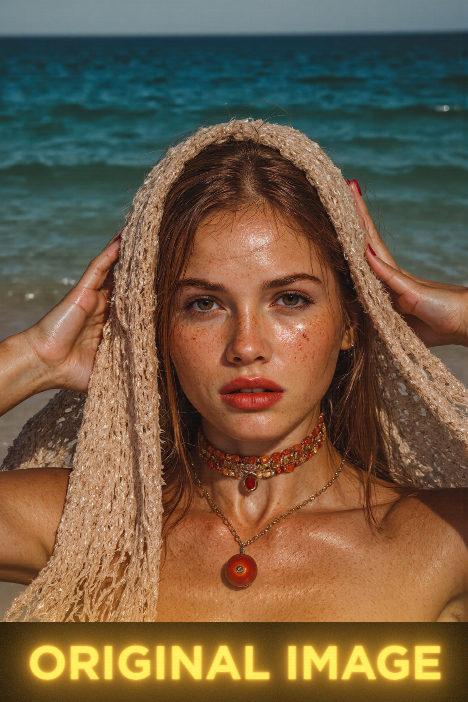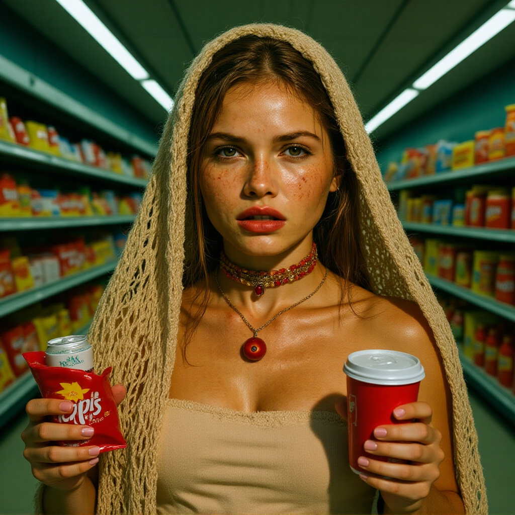 3-An Ultra realistic portrait of the stunningly beautiful woman with captivating hazel-green eyes and a constellation of natural freckles, captured in the candid, awkward style of amateur photography inside a brightly lit, sterile 24-hour convenience store at night. The photo is taken from a low angle, as if by a friend who has just caught her off guard. The primary light source is the harsh, green-tinted overhead fluorescent lighting, which creates deep, unflattering shadows under her eyes and chin and makes her skin look pale. She is standing in an aisle, holding a bag of chips in one hand and a soda in the other, looking up at the camera with a slightly annoyed, "Are you seriously taking a picture right now?" expression. Her delicate, beige crocheted net shawl is worn loosely over a simple t-shirt, looking completely out of place against the backdrop of brightly colored, branded snack packaging. Her signature intricate, reddish-orange beaded choker and gold pendant clash with the mundane setting. The composition is off-center, and the colors are slightly washed out due to the terrible lighting. The atmosphere is one of jarring, mundane reality.