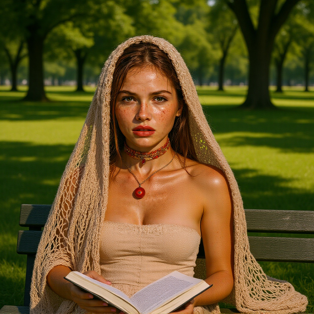 4-An Ultra realistic, medium shot of the stunningly beautiful woman with captivating hazel-green eyes and a constellation of natural freckles, captured in the candid, intrusive style of amateur photography. She is sitting on a park bench, and has just been interrupted while reading. She has looked up from her book, which is still in her lap, and is staring directly at the person holding the camera with an expression of mild, questioning annoyance. The bright, harsh midday sun filters through the leaves of a tree above, creating a distracting, dappled pattern of bright hotspots and deep shadows across her face and clothing. She wears a simple sundress, and her delicate, beige crocheted net shawl lies beside her on the bench. The camera's focus is slightly soft, and the composition is unbalanced, with too much empty space on one side. The photo captures a genuine, un-posed moment of being interrupted in a public space.