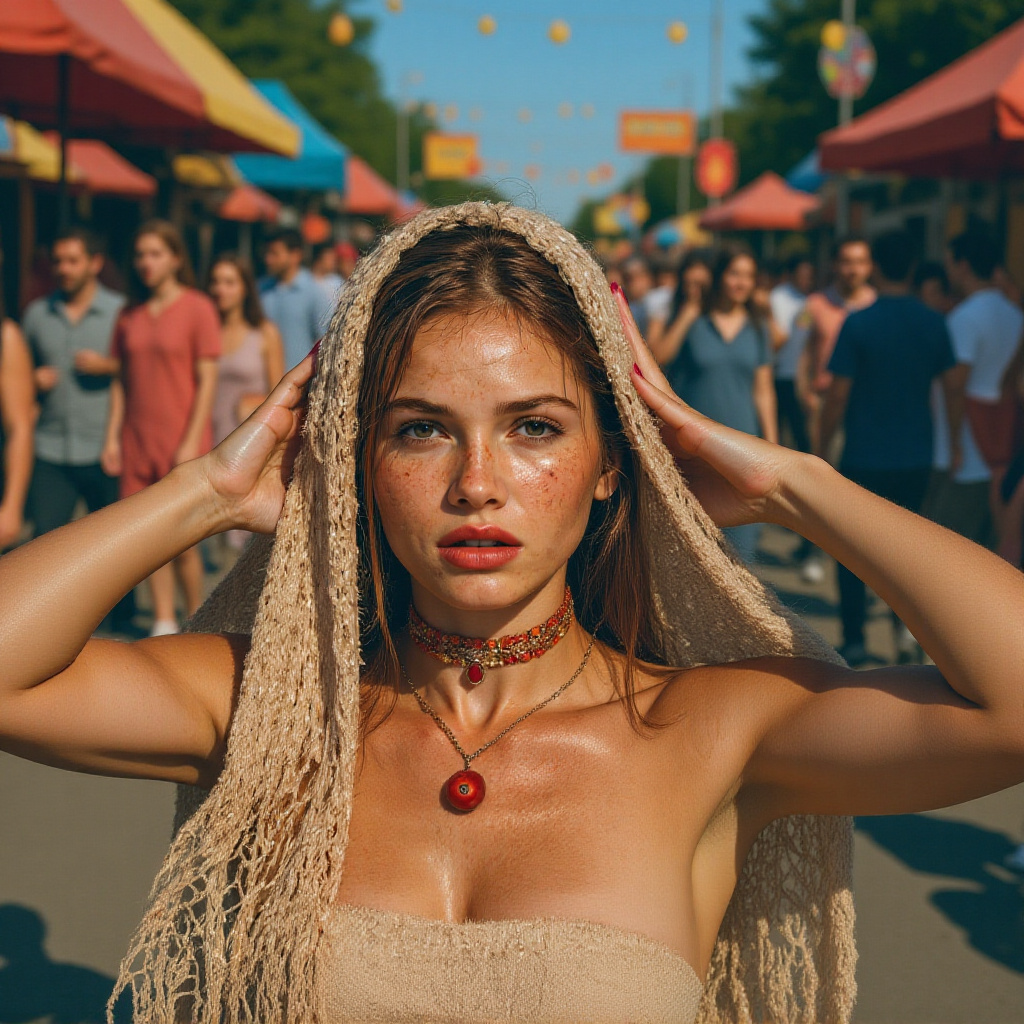 5-An Ultra realistic, medium portrait of the stunningly beautiful woman with captivating hazel-green eyes and a constellation of natural freckles, captured in the chaotic, snapshot style of amateur photography at a crowded outdoor street fair. She is looking directly at the camera, her expression a candid mix of surprise and a faint smile. She is wearing a simple summer dress. The bright, harsh midday sun is directly overhead, creating dark "raccoon" shadows under her eyes. The background is a noisy, distracting, out-of-focus bokeh of other people walking by, colorful vendor tents, and bright sunlight glinting off random objects. The composition is imperfect, with a stranger's shoulder encroaching on the edge of the frame. The photo feels like a genuine, fleeting moment stolen from a loud and busy day.