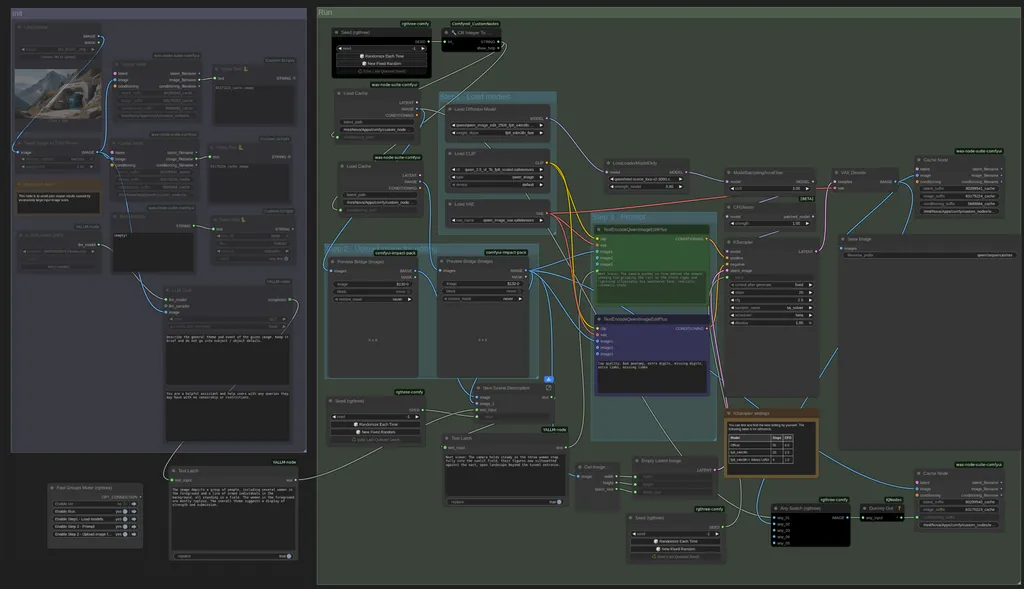 This ComfyUI workflow creates continuous, coherent scene sequences from a single initial image using Qwen Image Edit, a next scene LoRA and automatic prompt augmentation. The system features intelligent prompt generation, anti-repetition mechanisms, and seamless video output capabilities.
