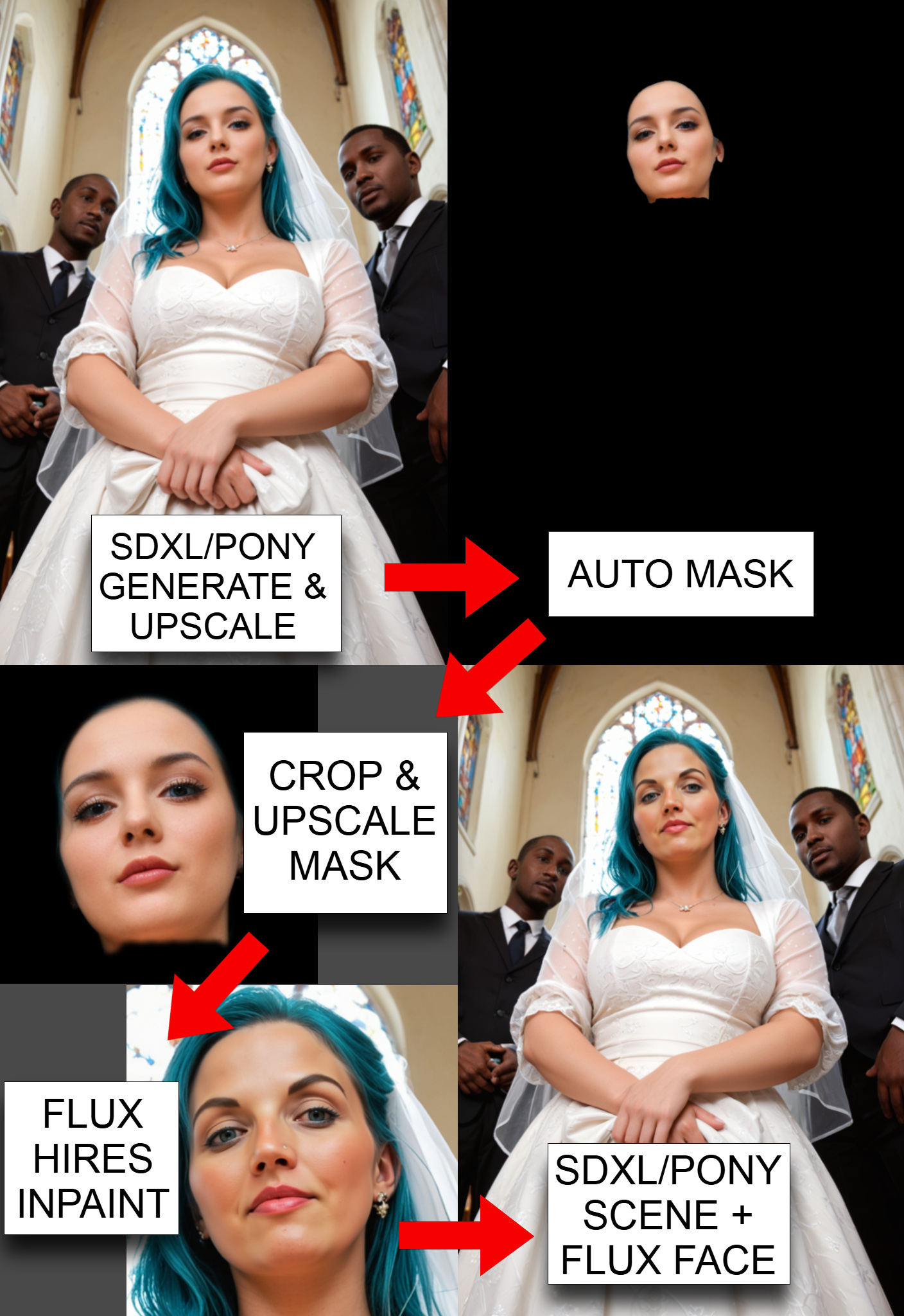 SDXL/Pony Scene Composition with FLUX Face Replacement/Inpainting