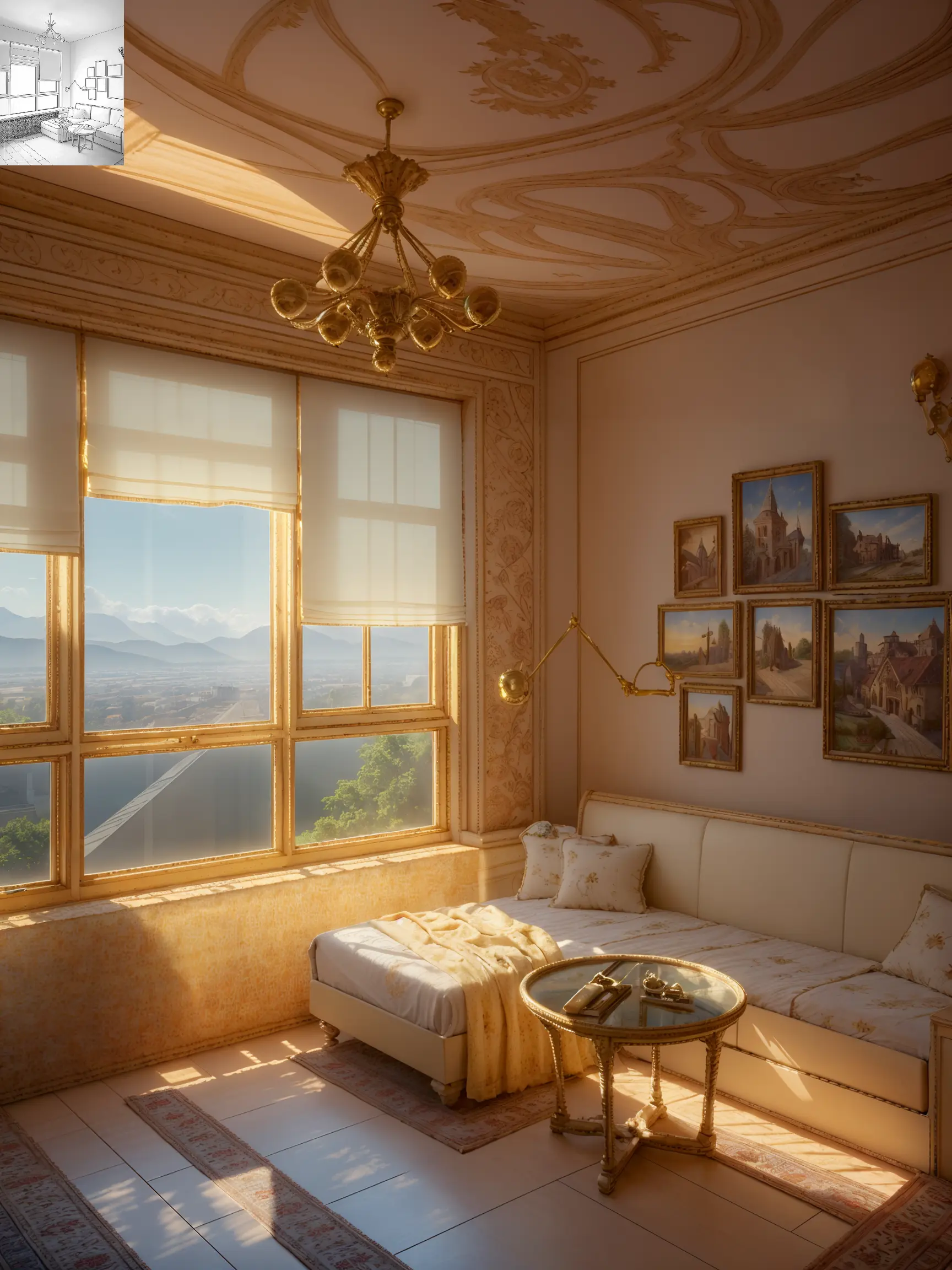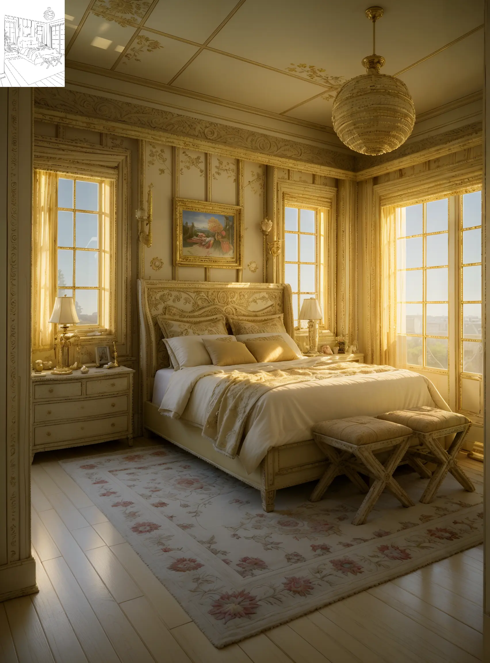 Input line draft and style picture, and generate effect picture with one key, without modeling and rendering.