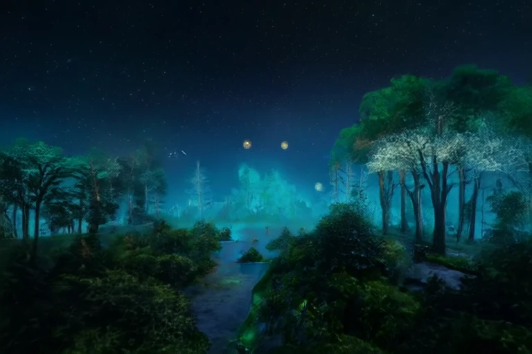 Create an incredibly beautiful picture inspired by nature and fantasy. The image should feature a magical forest with giant glowing trees, bioluminescent plants, and a mysterious mist covering the ground. In the center of the composition, there should be a crystal-clear lake reflecting a starry sky with two moons. Add small details: fireflies floating in the air and ancient ruins covered in moss, creating an atmosphere of mystery. The style should be hyperrealism with elements of fantasy, featuring vibrant colors, soft glows, and high detail