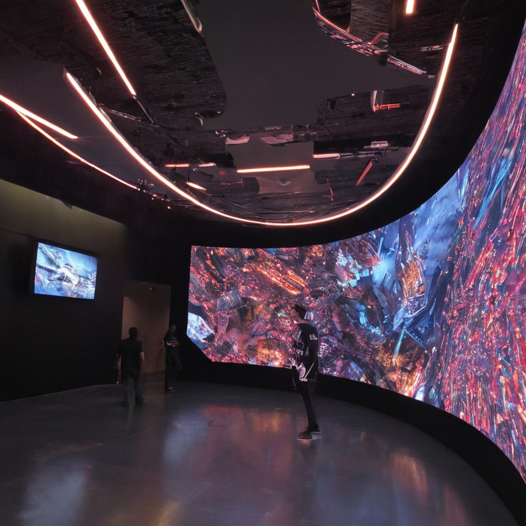 Anamorphic/Three-D shaped immersive LED screen illusion," endless possibilities for creativity, depth, and dimension, perfect for a real-time game simulation. Let's capture the dynamic atmosphere, intense excitement, and futuristic vibes. Think high-tech camera settings to enhance the futuristic feel.