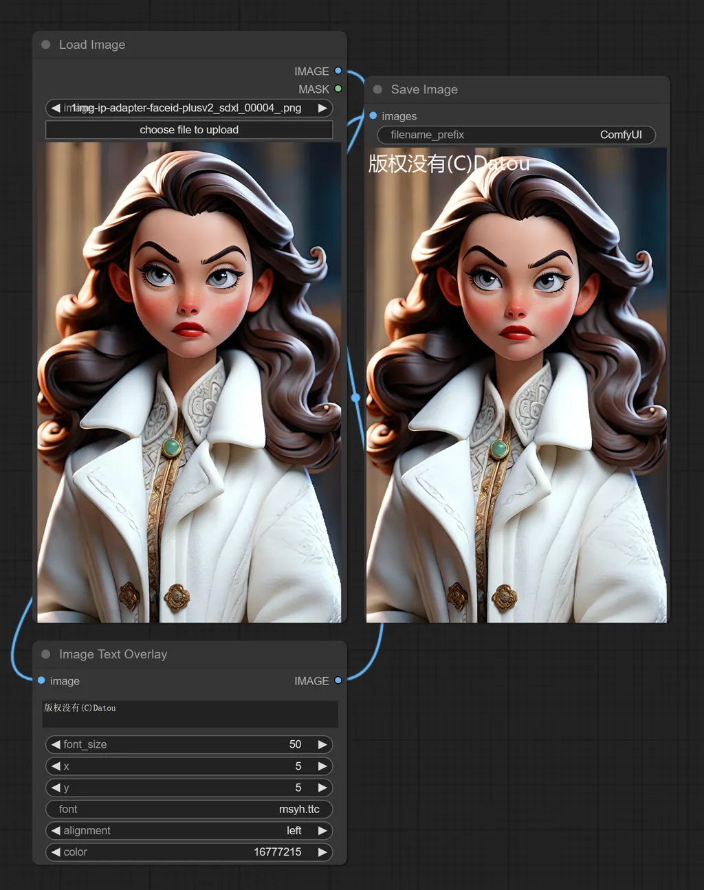 需要用到一个自定义节点,请仔细阅读说明进行安装使用。font一栏填写msyh.ttc就可以调用windows自带的雅黑中文字体了,颜色按0xFFFFFF的格式填写,输入进去后会自动变成十进制数字。