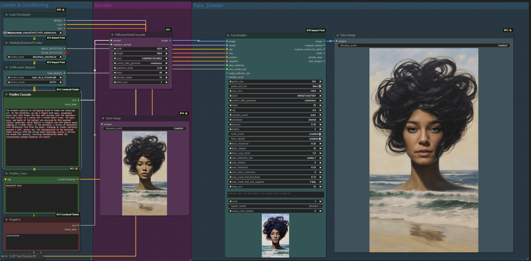 Comfyui now supports native stable cascade, so the diffusers sampler from v1 is no longer needed. The workflow generates images with sd cascade and improves face details if needed with an sd1.5 model.