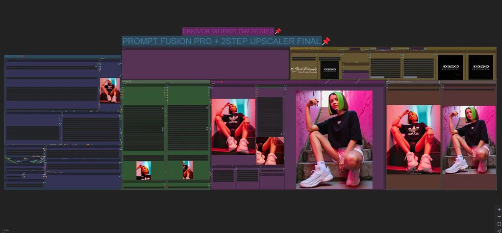 This ComfyUI workflow, designed by EKKIVOK, integrates multiple advanced nodes to create, detail, and upscale images with exceptional quality, focusing on prompt fusion, detail refinement, upscaling, and the introduction of film grain for photorealism. The workflow features a custom-built noise and film grain injector system, which enhances the image by adding grain to simulate natural photographic imperfections, making the output more lifelike.