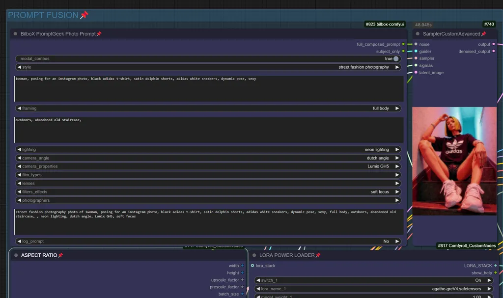 - Prompt Fusion:The BilboXPhotoPrompt node composes complex photo prompts, tailored for "street fashion photography" and similar genres. It integrates key inputs such as camera type (Lumix GH5), location, pose, and photography features to craft detailed prompts.The CLIPTextEncodeFlux node encodes the text prompt, conditioning the model to accurately reflect the described scene with focus on both the subject's style and the setting.