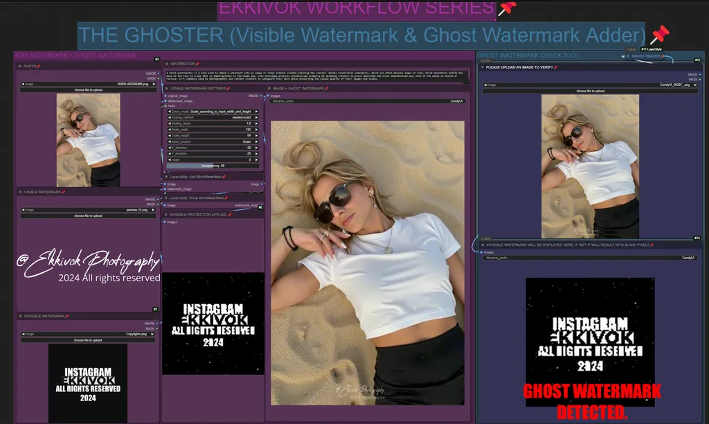 Introducing "The Ghoster," a powerful ComfyUI workflow designed to add both visible and invisible watermarks to your AI-generated art! This workflow ensures your creations are protected while keeping their visual appeal intact. With visible watermarks, you can showcase your brand, and with the invisible "blind watermark," your art gets an extra layer of protection that can’t be altered or removed. Blind watermarks embed ownership data within the image itself, making it impossible for unauthorized users to delete or tamper with your work.