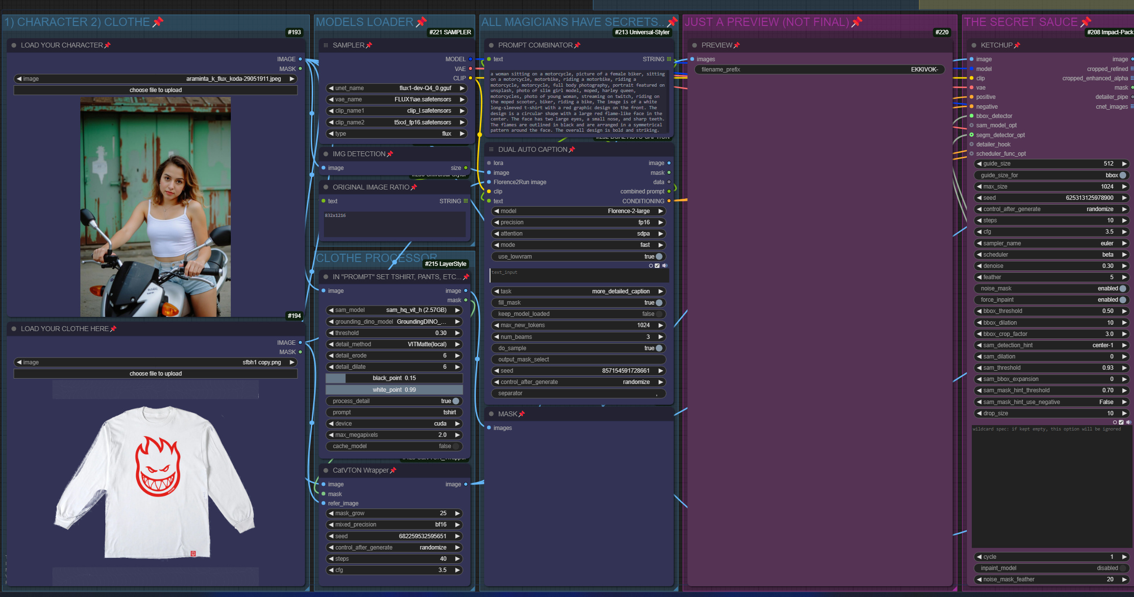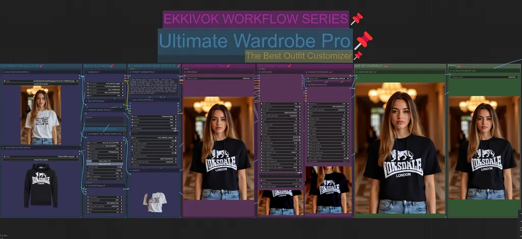 Ultimate Wardrobe Pro by EKKIVOK is the ultimate tool for seamless, professional-grade clothing transformations. This workflow is designed to provide hyper-realistic outfit swaps and customizations with unparalleled precision, making it perfect for digital artists, fashion designers, and creators who need professional results.