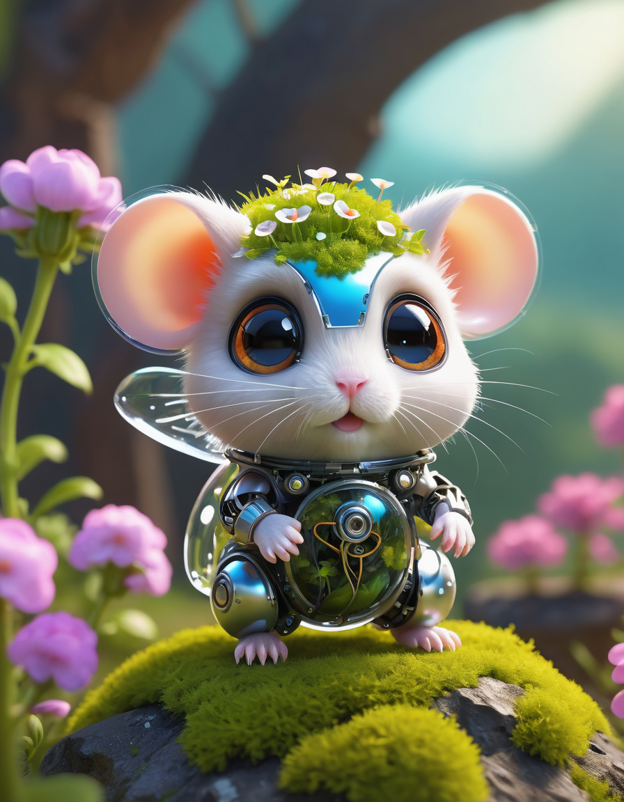 Cute big eyes micro flower translucent hamster, with half robotic body, artstation, Alien Flora, fantastic landscape,