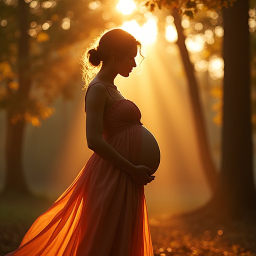 Ethereal maternity portrait, glowing pregnant woman in flowing silk gown, backlit by dawn light through forest canopy, Phase One XF IQ4, 80mm f/2.8, Kodak Ektachrome film simulation, bokeh shaped like maple leaves, delicate skin texture, renaissance painting atmosphere --ar 4:5 --no jewelry --v 5