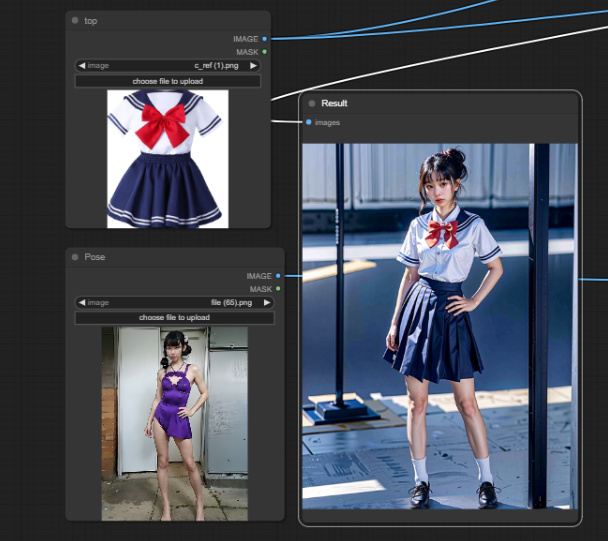 If you want to reproduce the results like the example picture, you can get the model you like from Civitai, provide the character pose reference, face image, clothes, and background to complete it in this workflow.