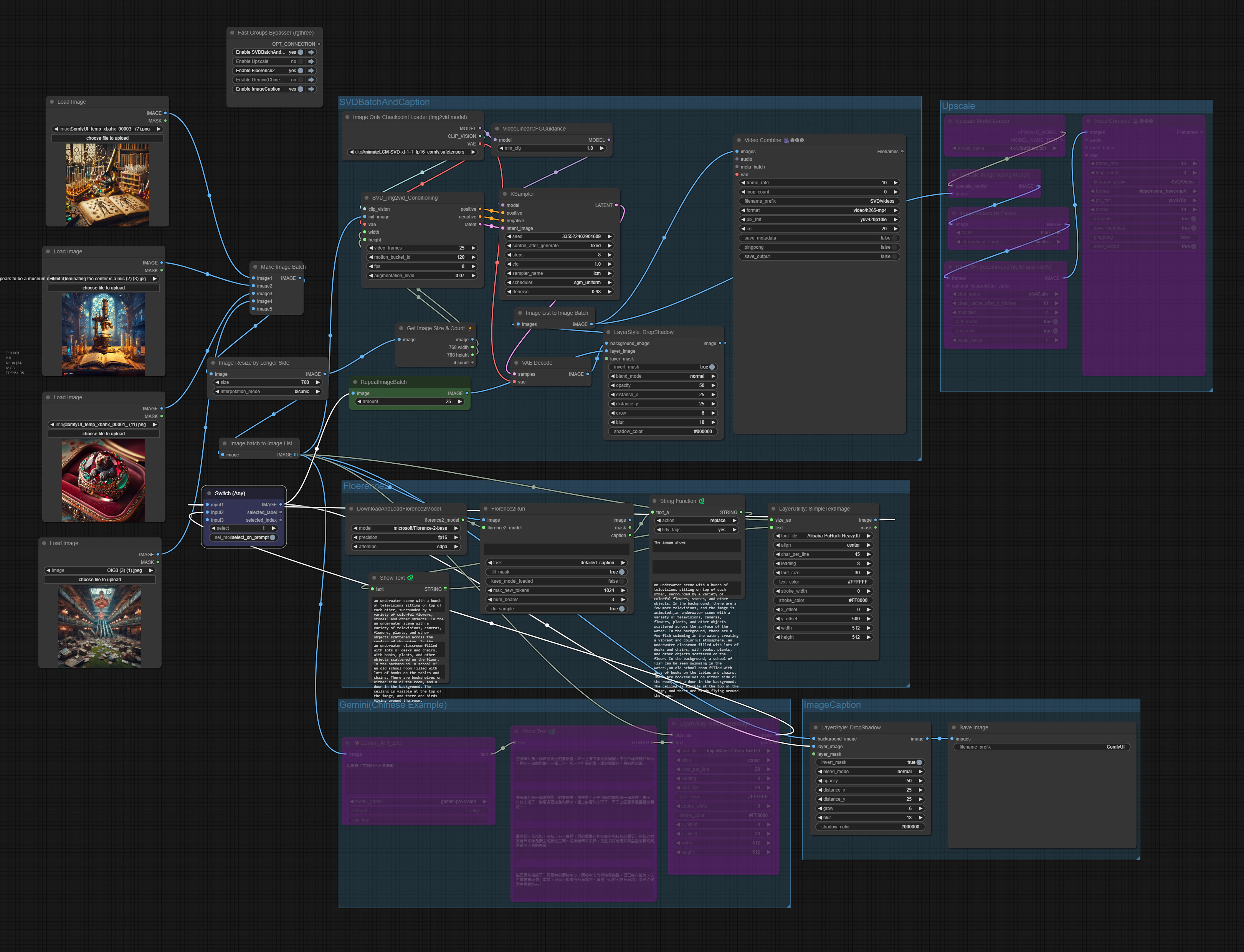工作流完全透过ComfyUI完成,不需要其他软件上字幕,且图片说明均由AI产生,工作流的群组分类如下。
