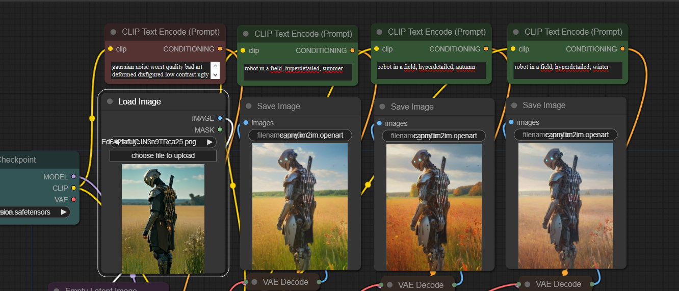 👉 Canny ControlNet on uploaded image -> 3 different prompts -> 3 images with the same pose. Perfect to try the same prompt with variations of color (red, blue, green) or season (summer, autumn, winter), or artists, etc.