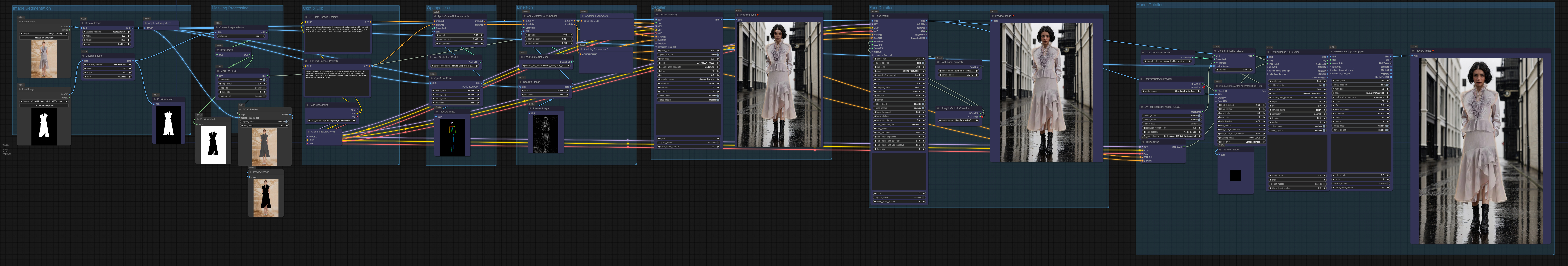 Workflow for changing models in fashion products. controlnet openpose/lineart 、detailer(segs)、facedetailer、handsdetailer.