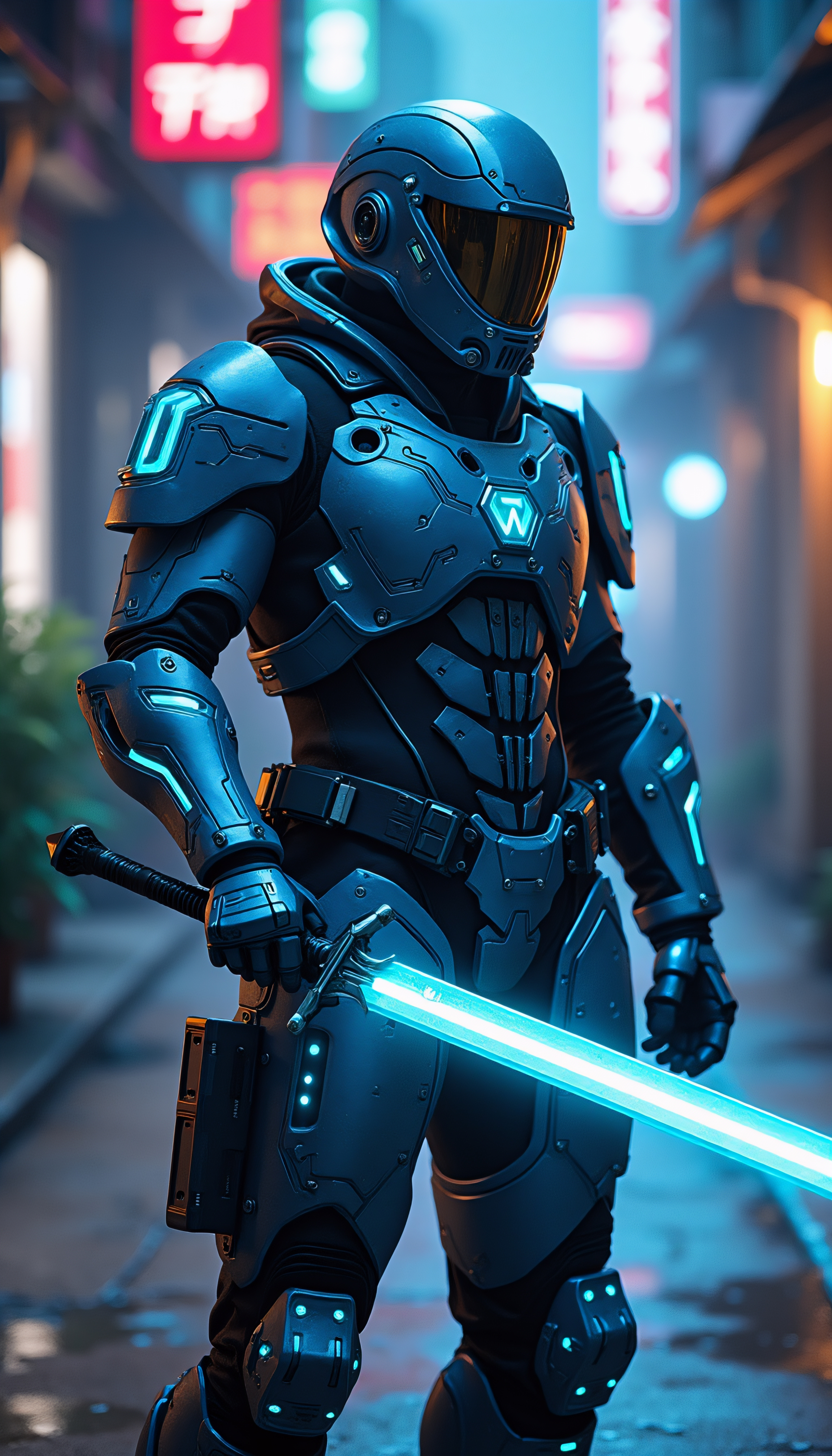 Prompt for cyberpunk: A futuristic cyberpunk warrior with neon blue armor, a sleek helmet with a visor, and glowing circuitry patterns on the suit. The character wields a high-tech energy sword, standing in a neon-lit alley