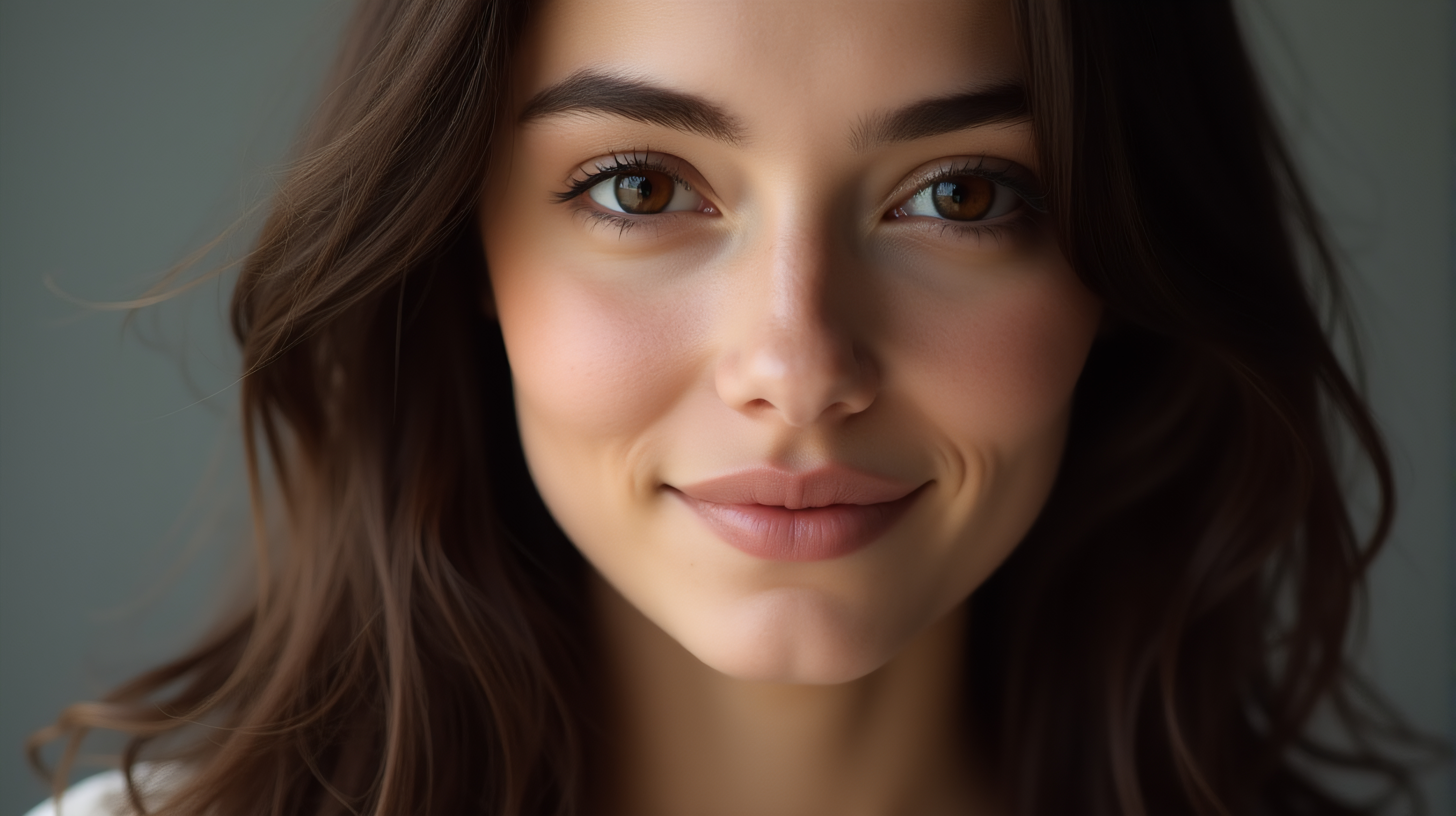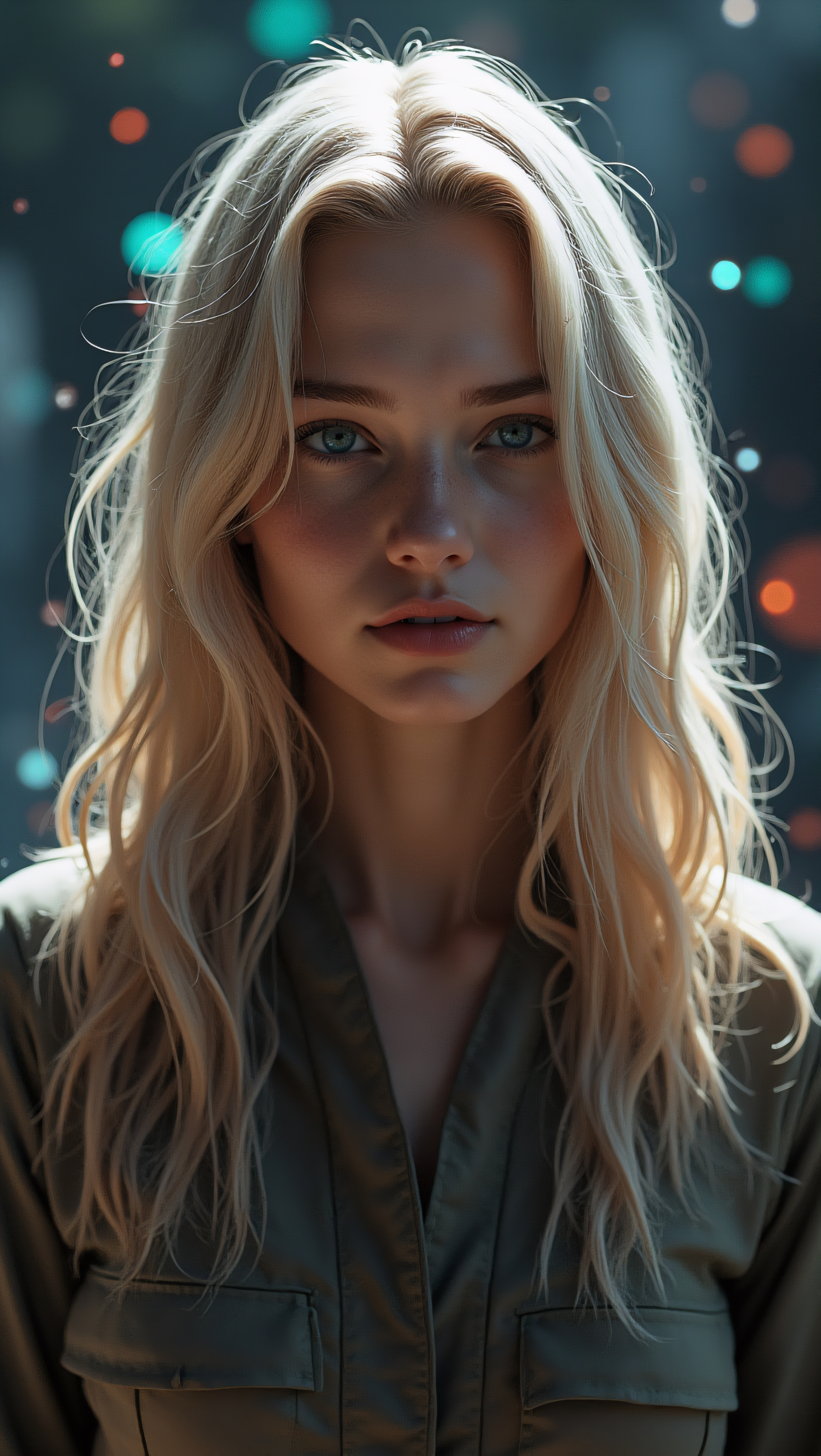 Portrait: ultra-realistic portrait of an elderly woman with deep wrinkles and silver hair tied in a loose bun. Her skin is textured with age spots and fine lines, and her eyes are a striking light blue, filled with wisdom and warmth. She wears a simple, elegant dress in a muted color, with a delicate lace collar. The background is softly blurred, emphasizing her face and expression, capturing the natural beauty and character of her years