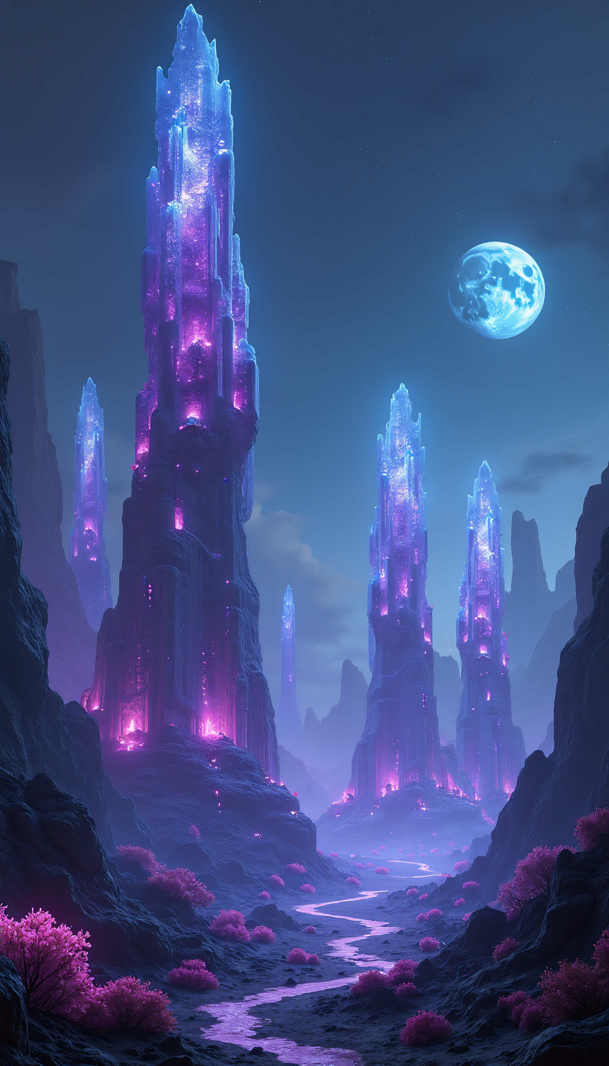 Alien Planet: An alien planet with towering crystalline structures glowing in various shades of blue and purple. The sky is filled with multiple moons and distant stars, and the ground is covered in strange, bioluminescent flora