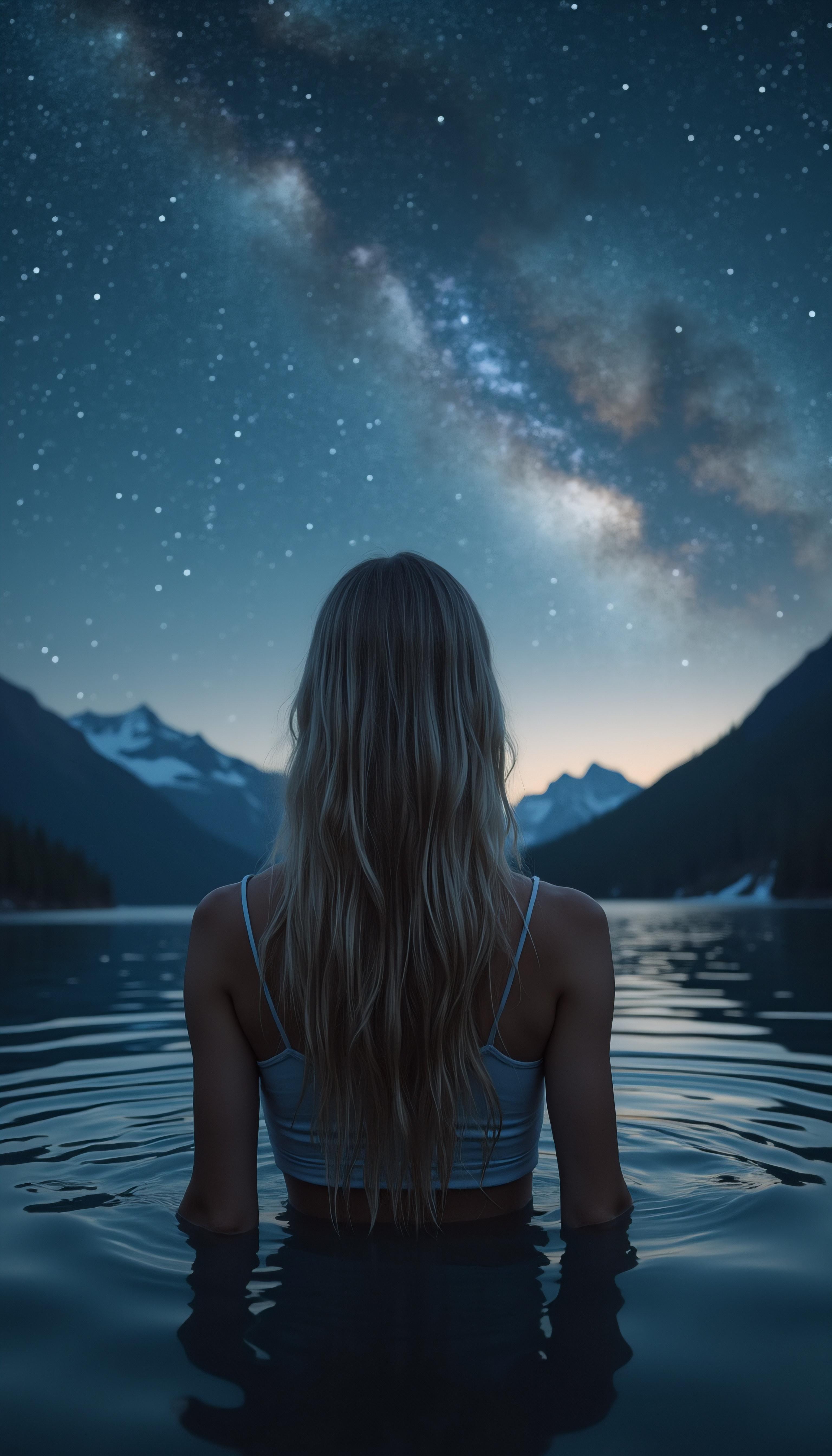 Woman in the water: Woman with blonde hair, standing in water, picture taken at night, a lot of stars and galaxies in the sky, from the side shines a dim light, in far background are mountains (ultra realistic), (picture taken from the back)