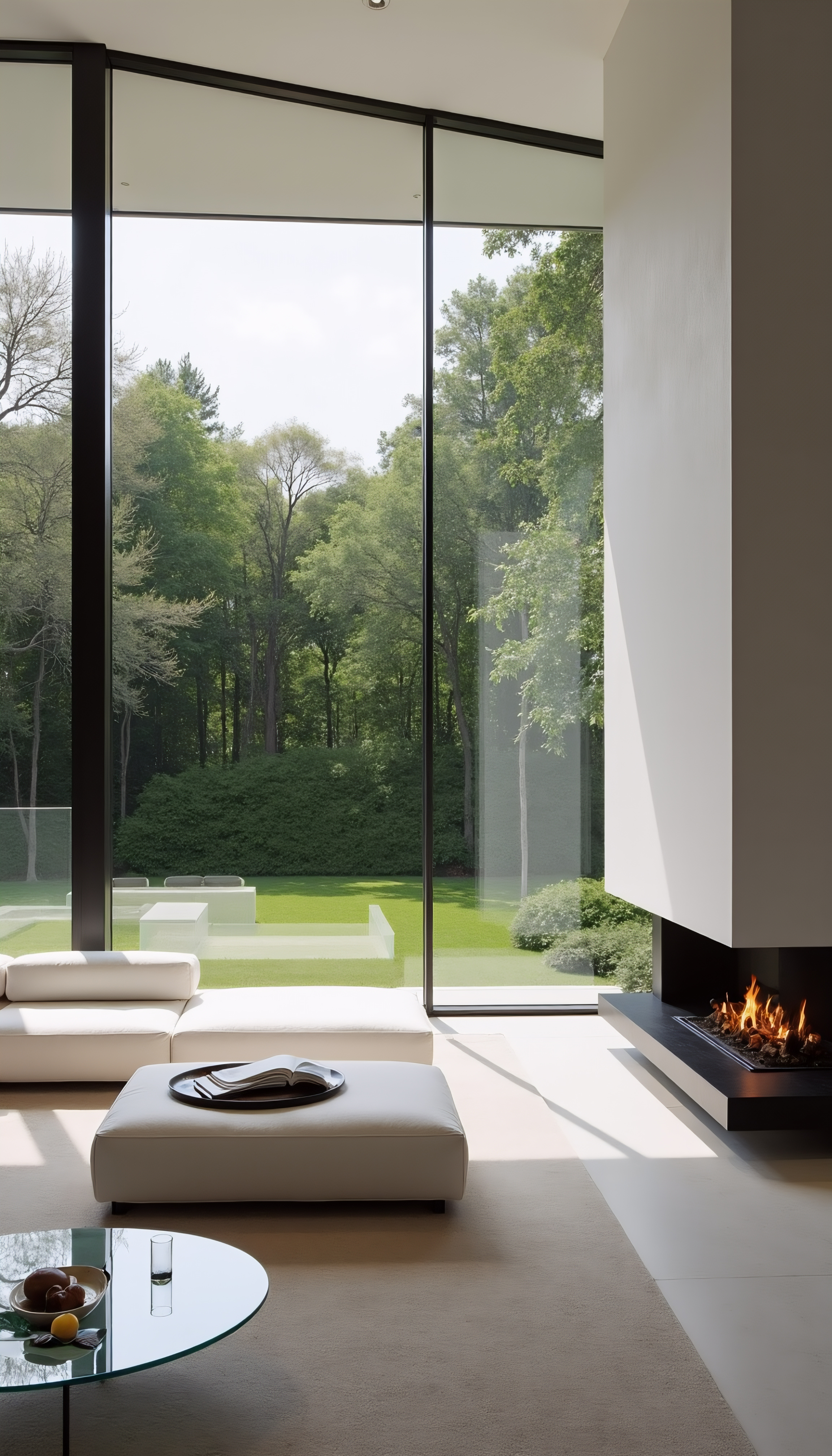 Room: A modern, minimalist living room with floor-to-ceiling windows that overlook a lush garden. The room features a white sectional sofa, a glass coffee table, and a sleek, wall-mounted fireplace