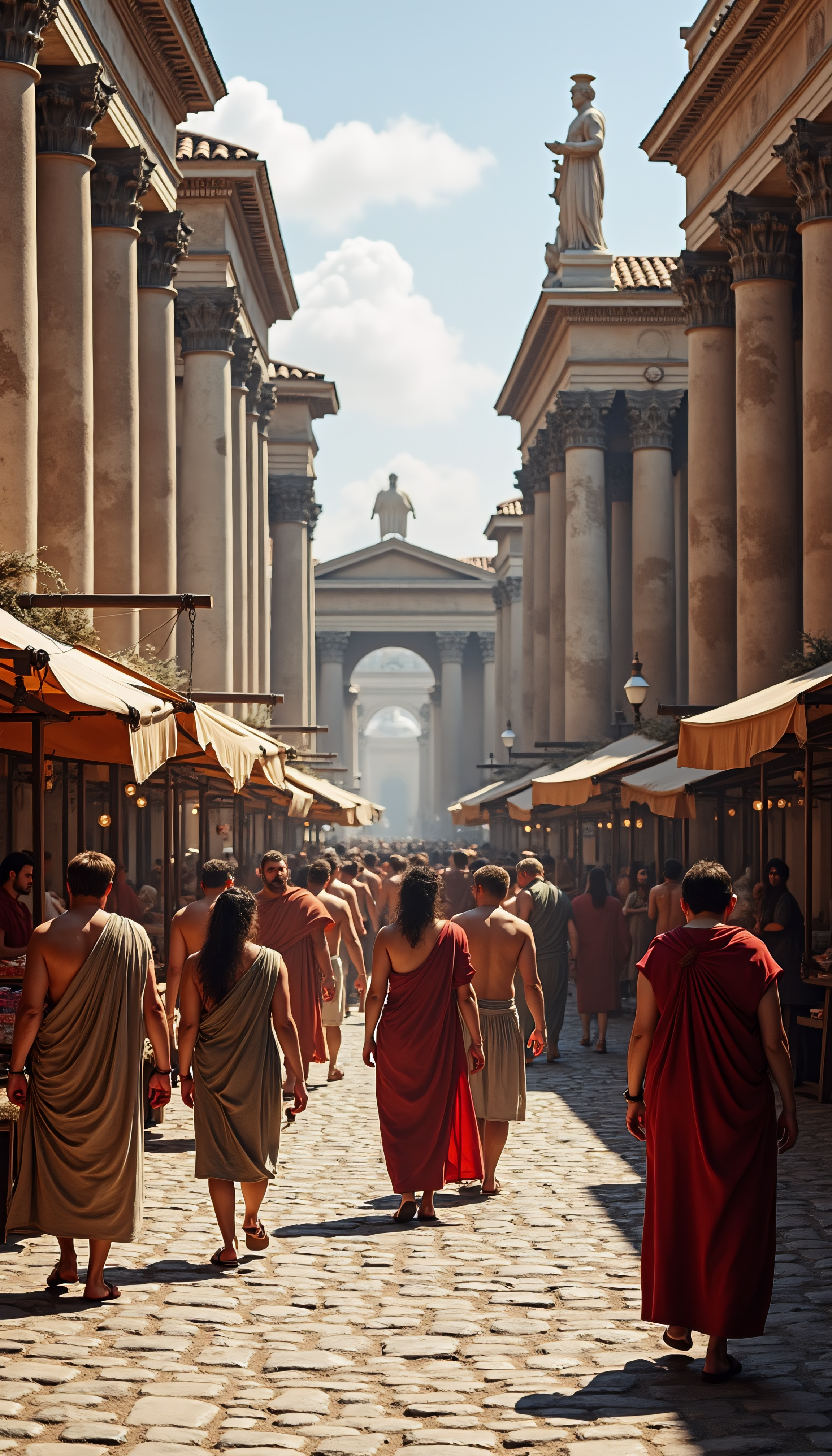 Roman Marketplace: An ancient Roman marketplace bustling with activity. Vendors in traditional Roman attire sell goods at wooden stalls, while citizens in togas and sandals walk along cobblestone streets. The architecture is grand with marble columns and statues.