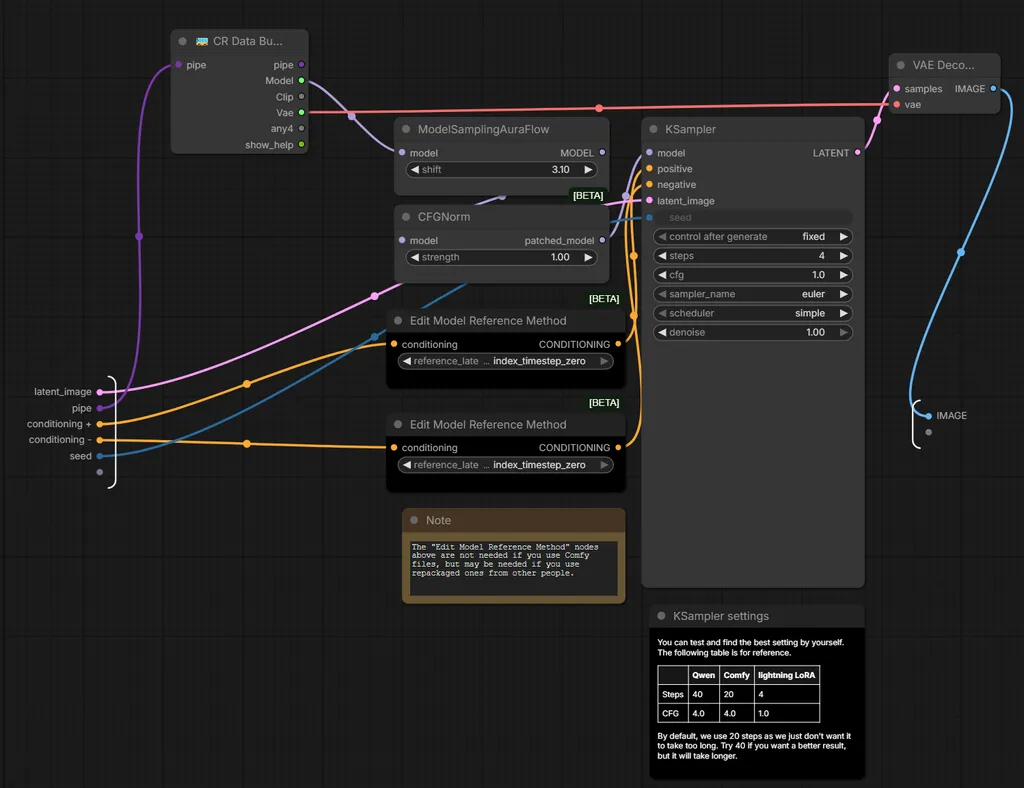 - KSampler Configuration:Steps: 4Sampler: EulerScheduler: Simple (Required for Qwen architecture)Denoise: 1.00 (Full reconstruction)CFG: 1.0
