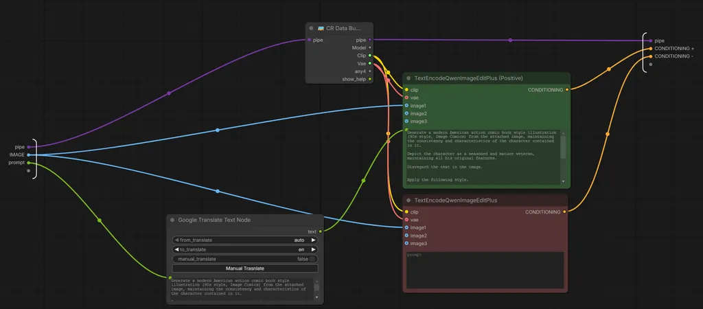 - Qwen Encoding: The TextEncodeQwenImageEditPlus node fuses the translated text prompt with the visual data from the original input image.