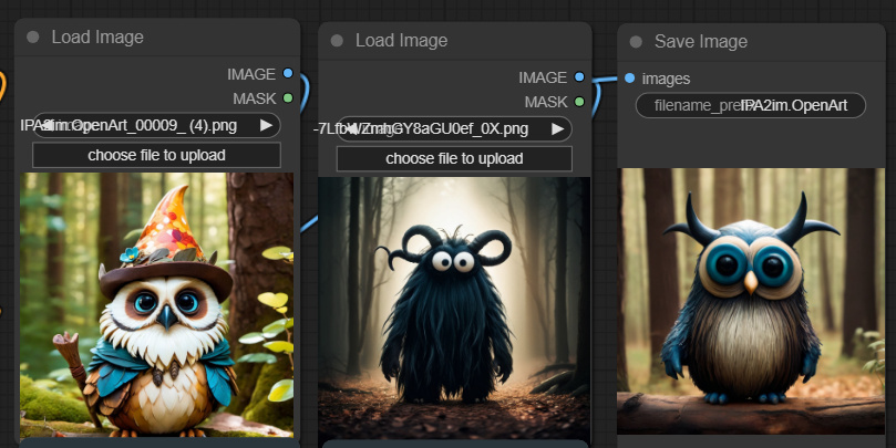 - Play with the weight, noise and cfg values to get more or less influence of the images or prompt.