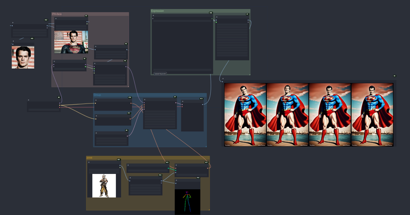 This workflow demonstrates a comprehensive process to control the face, pose, and expression of a character in a digital art piece. The process is divided into several stages, each focusing on a different aspect of character manipulation to achieve the desired visual outcome.