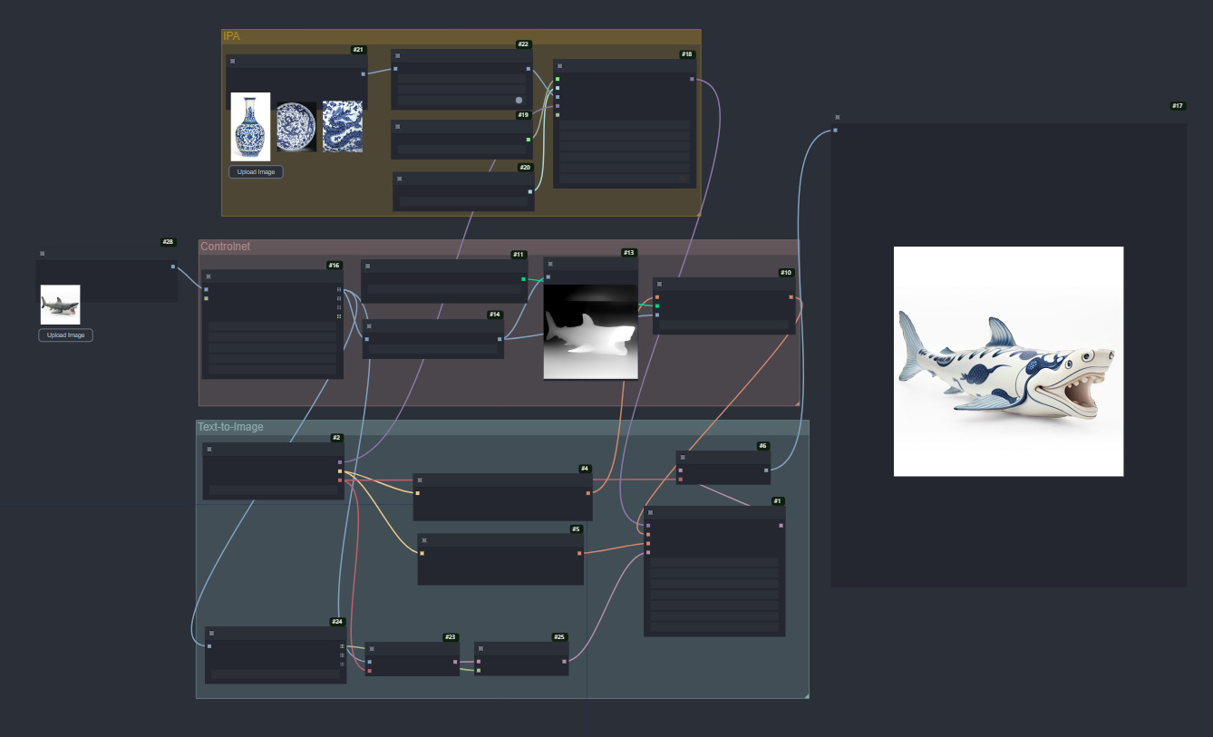 This workflow is designed for image processing, combining multiple nodes to achieve operations such as depth map generation, background removal, and image editing. It utilizes nodes like KSampler, CLIP Text Encode, VAE Decode to encode, decode, and generate images. Additionally, ControlNet model and IPAdapter model are used for image control and style transfer. The resulting images can be used for material reference, image editing, and other applications.