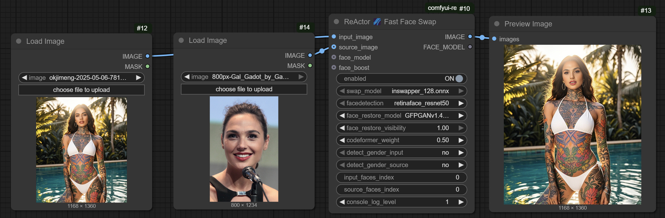 This is a high-performance face swap workflow built using ComfyUI, featuring the ReActor module for fast and seamless face replacement. It combines precise face detection with restoration enhancements to deliver highly natural results.