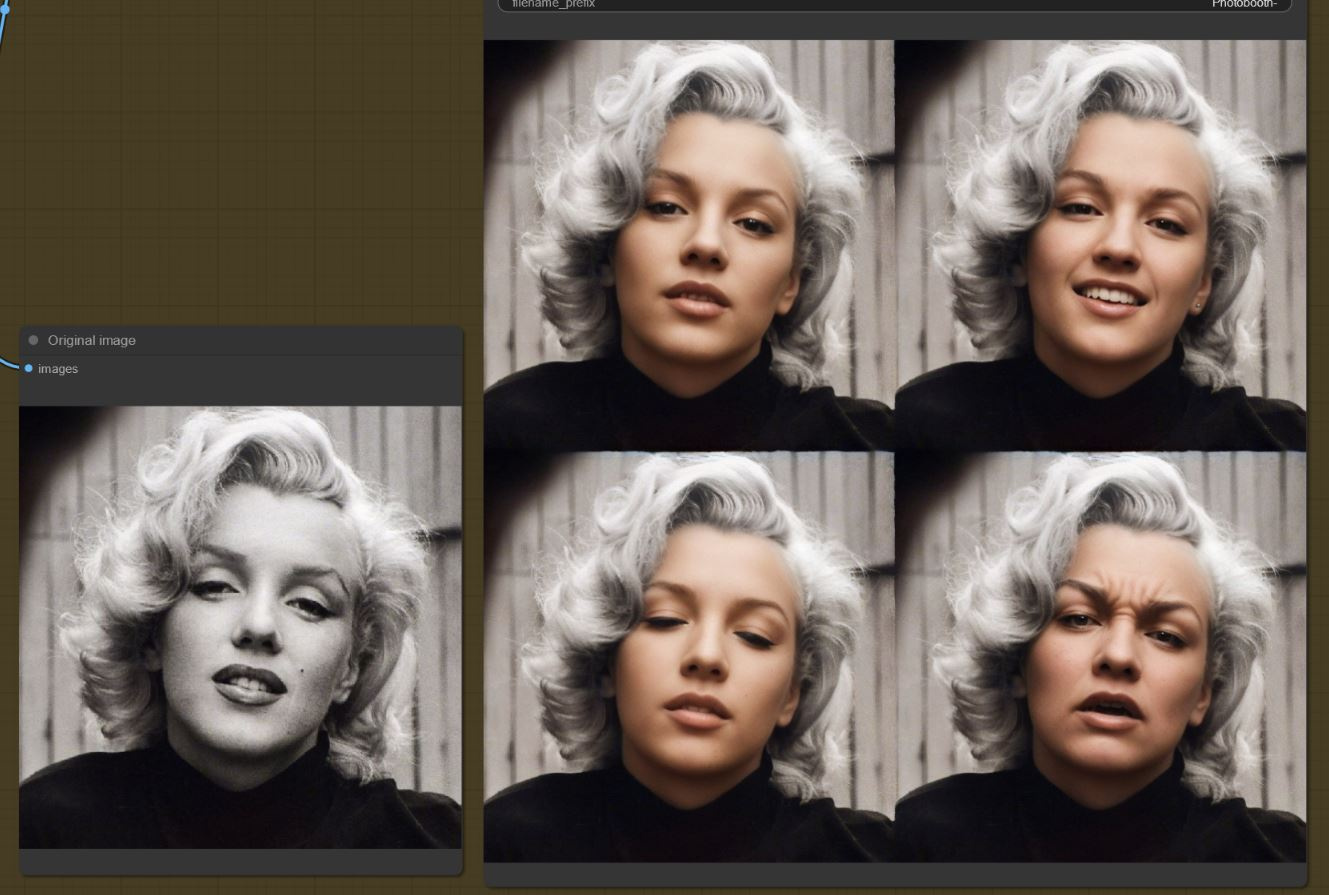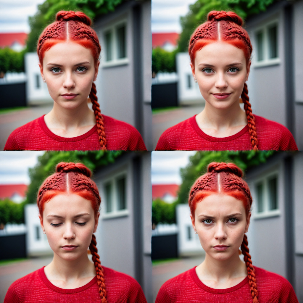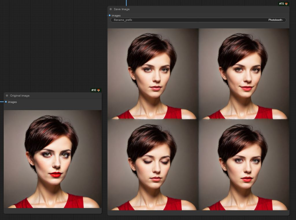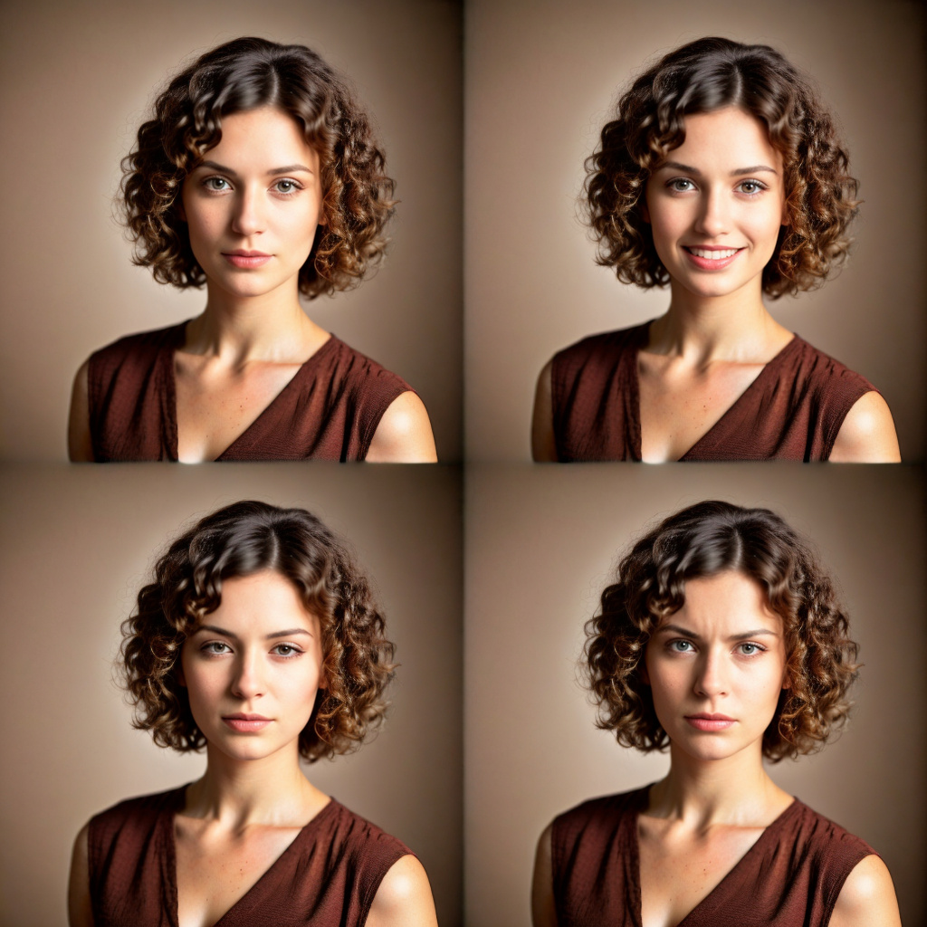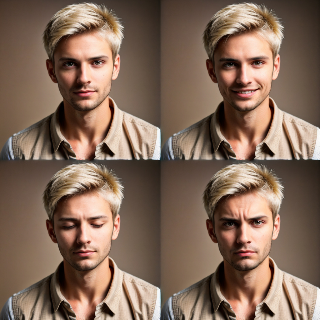 And generates 1 image with 4 versions of the person from the input photo in four different facial expressions.