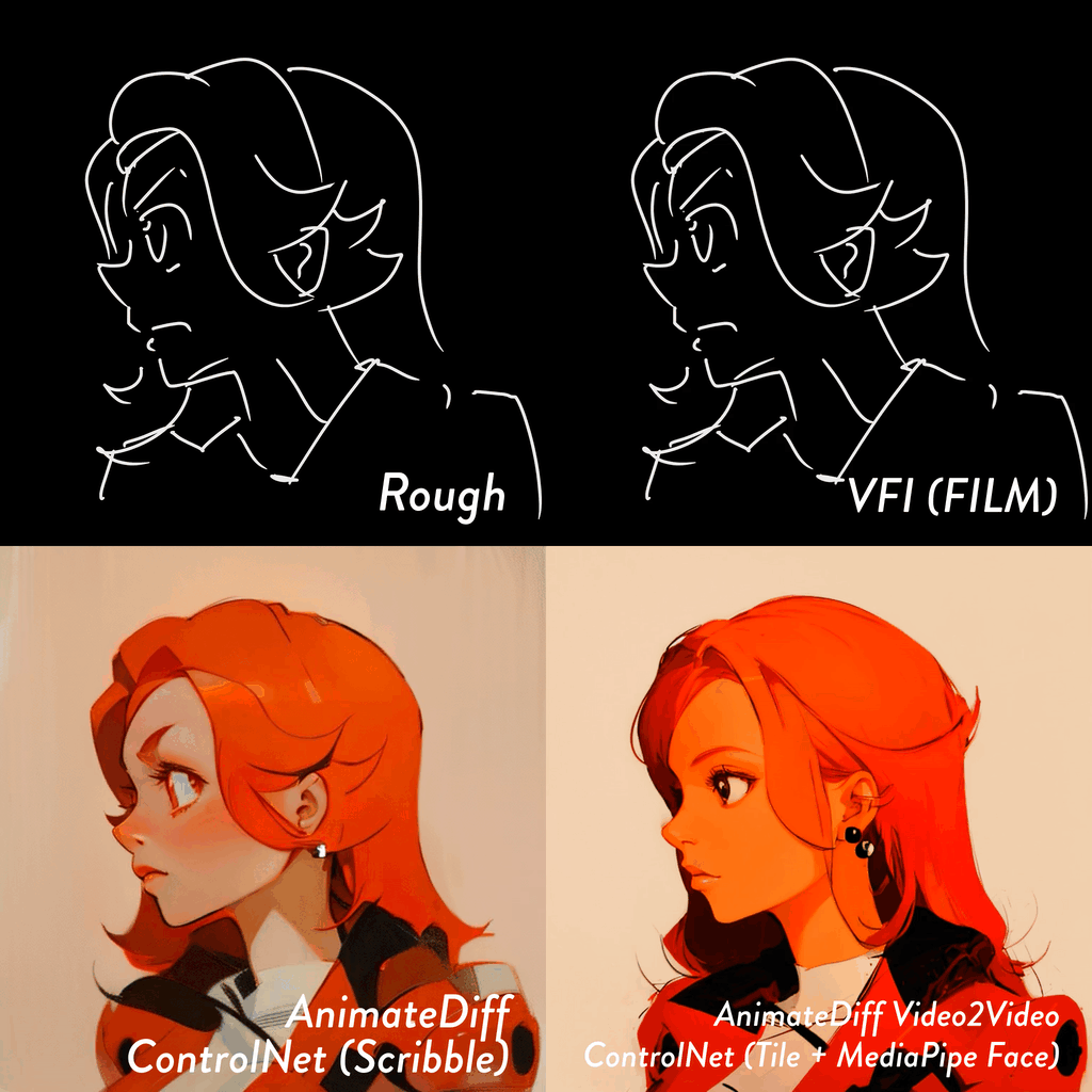 - The idea is to apply AnimateDiff for video2video conversion after frame interpolation of the key frames using VFI.