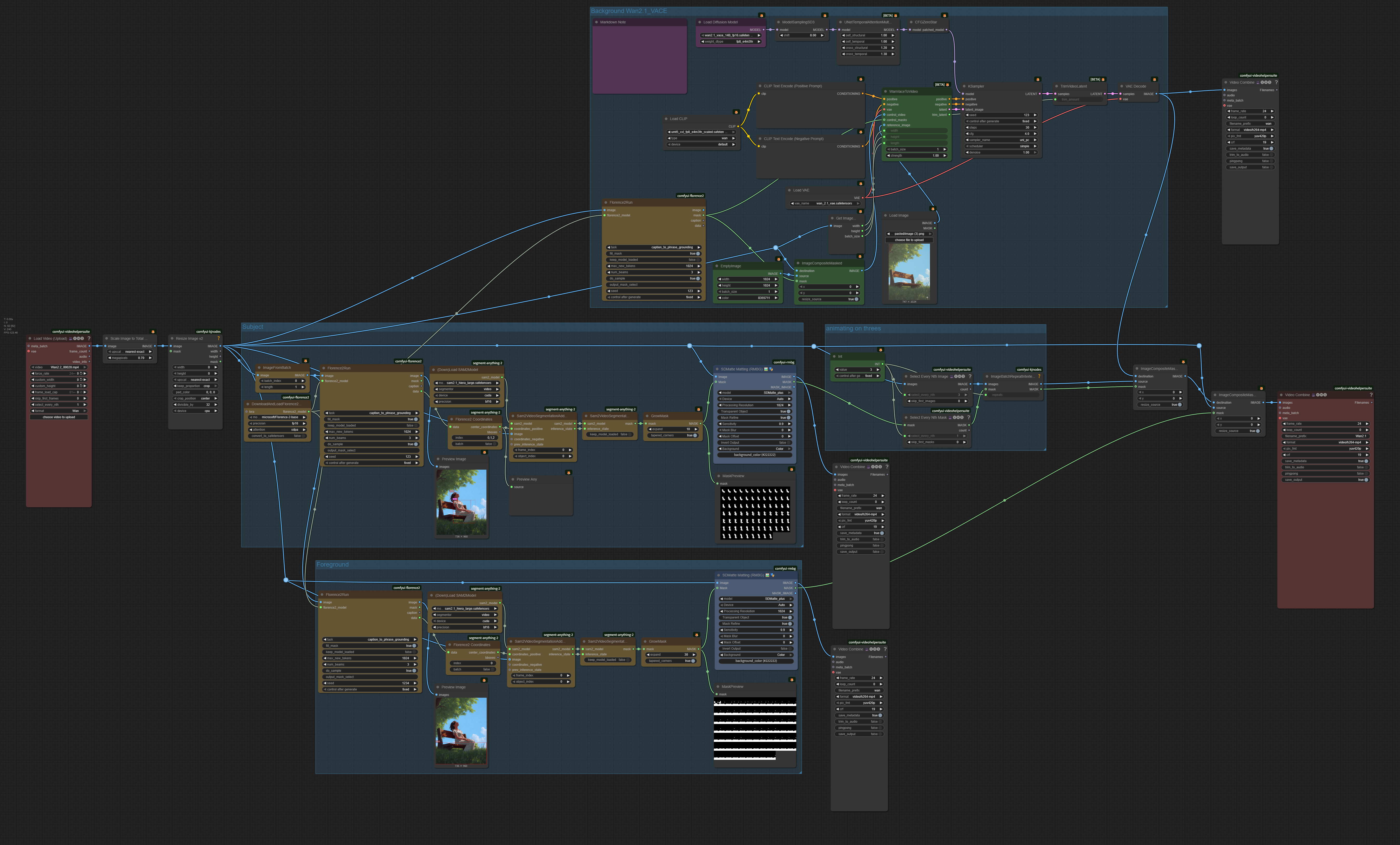 - The subject (and optional foreground) are segmented with Florence-2 + SAM 2.1, then refined with SDMatte for clean alpha matting.