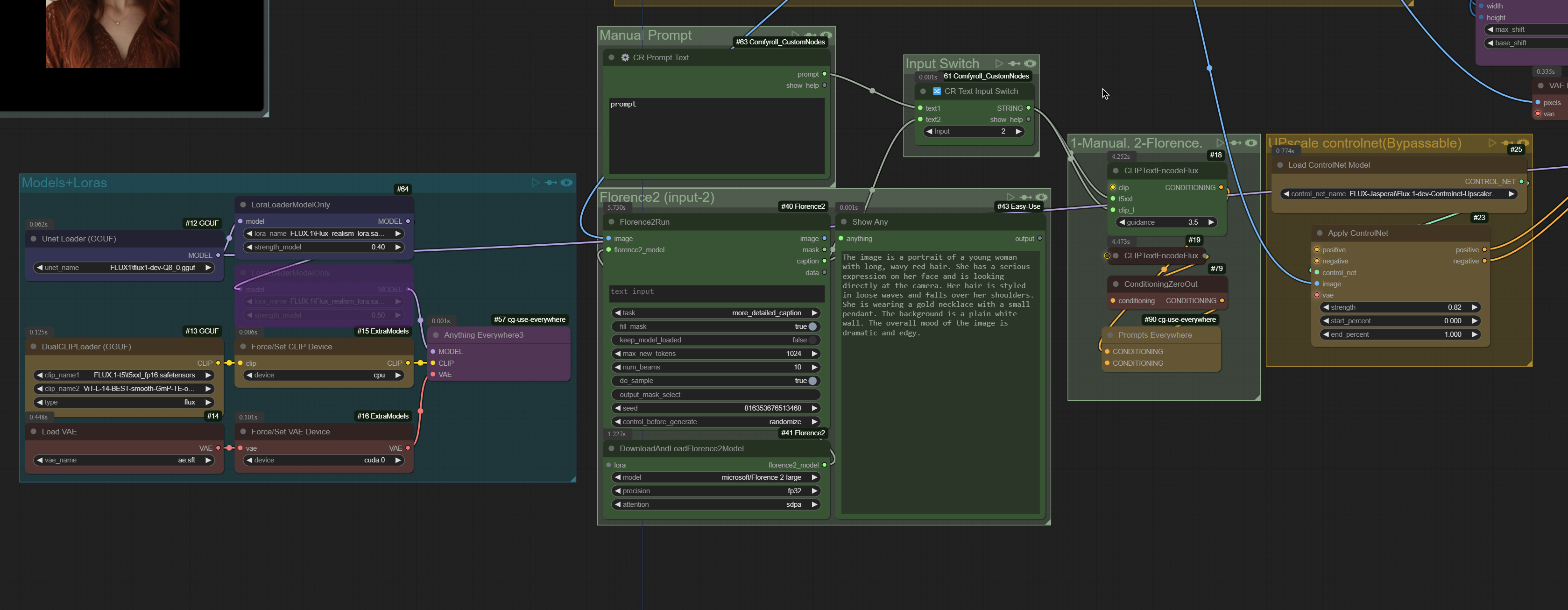Just a basic FLUX upscale workflow with CNet upscaler and SD upscale, also includs Lora node and Florence2 prompter.