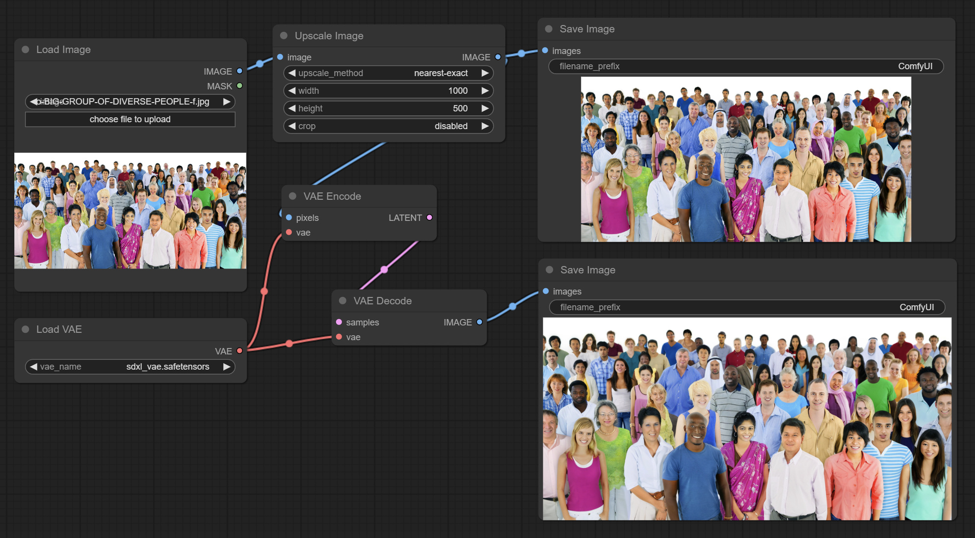 This simple workflow helps you investigate and study the effect of VAE in isolation. It will simply compress the input image and decompress it back. You can compare the input image and the output image to notice the artifacts.