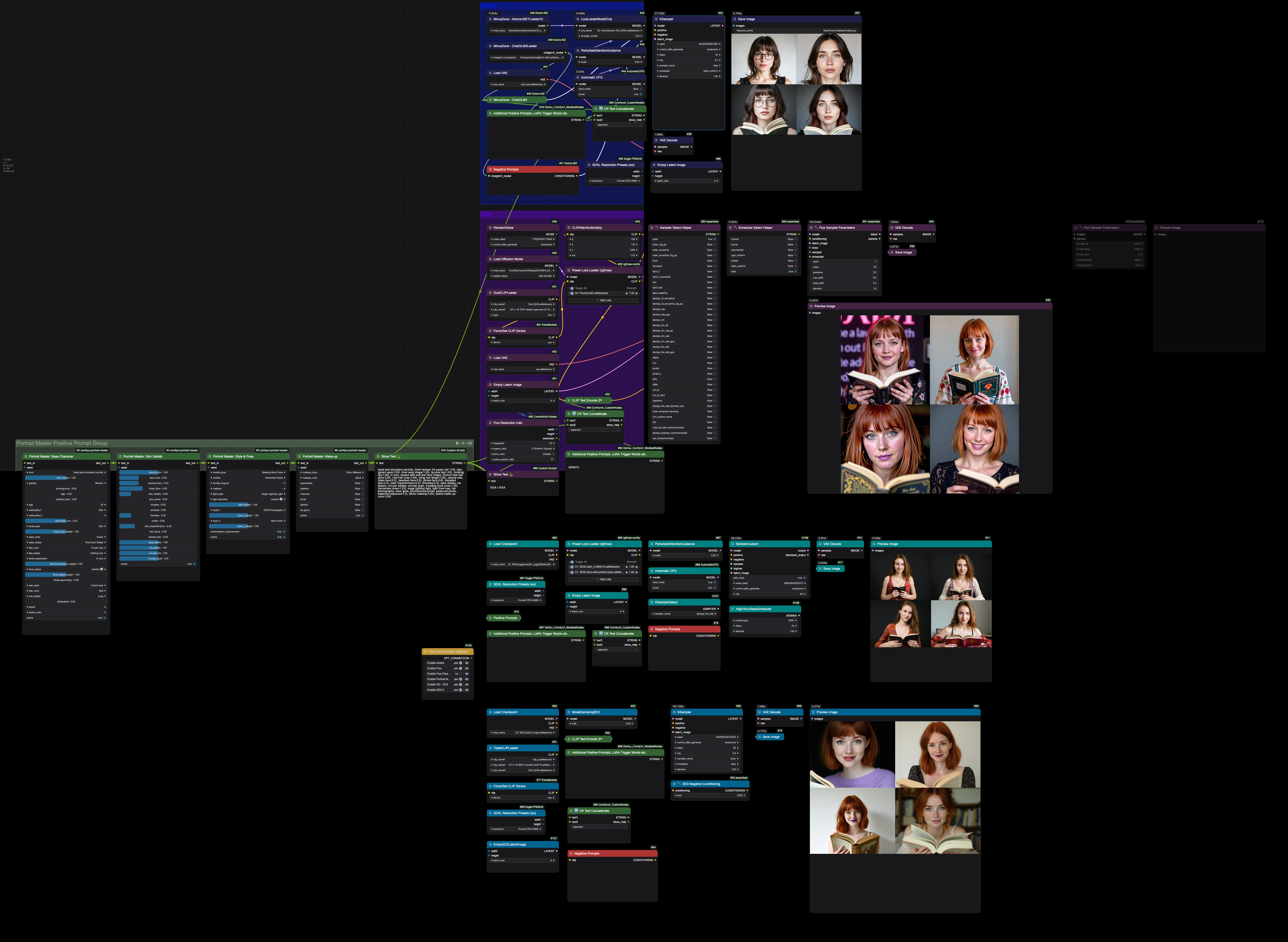 Uses the Portrait Master nodes to create the prompt and that feeds into 4 different models; Kwai-Kolors, Flux, SD and SD3.5.