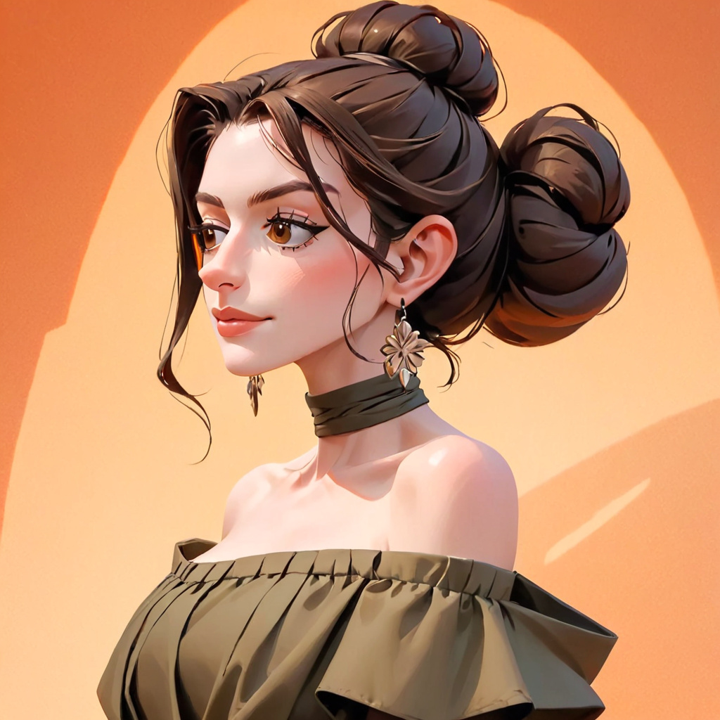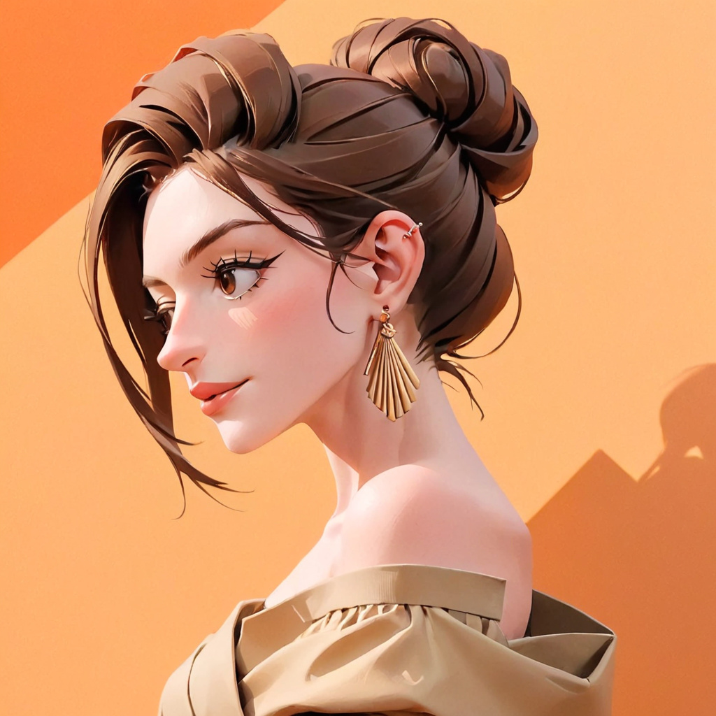 1 girl img,female,brunette,hair bun,orange background,artistic,portrait,close-up,fashion,off-shoulder clothing,pleated fabric,minimalistic,contemporary,looking at the viewer,warm lighting,shadows,collarbone,elegant,stylish,earrings,skin,sunset tone,smooth texture,high contrast,high quality,symmetrical composition,dramatic light